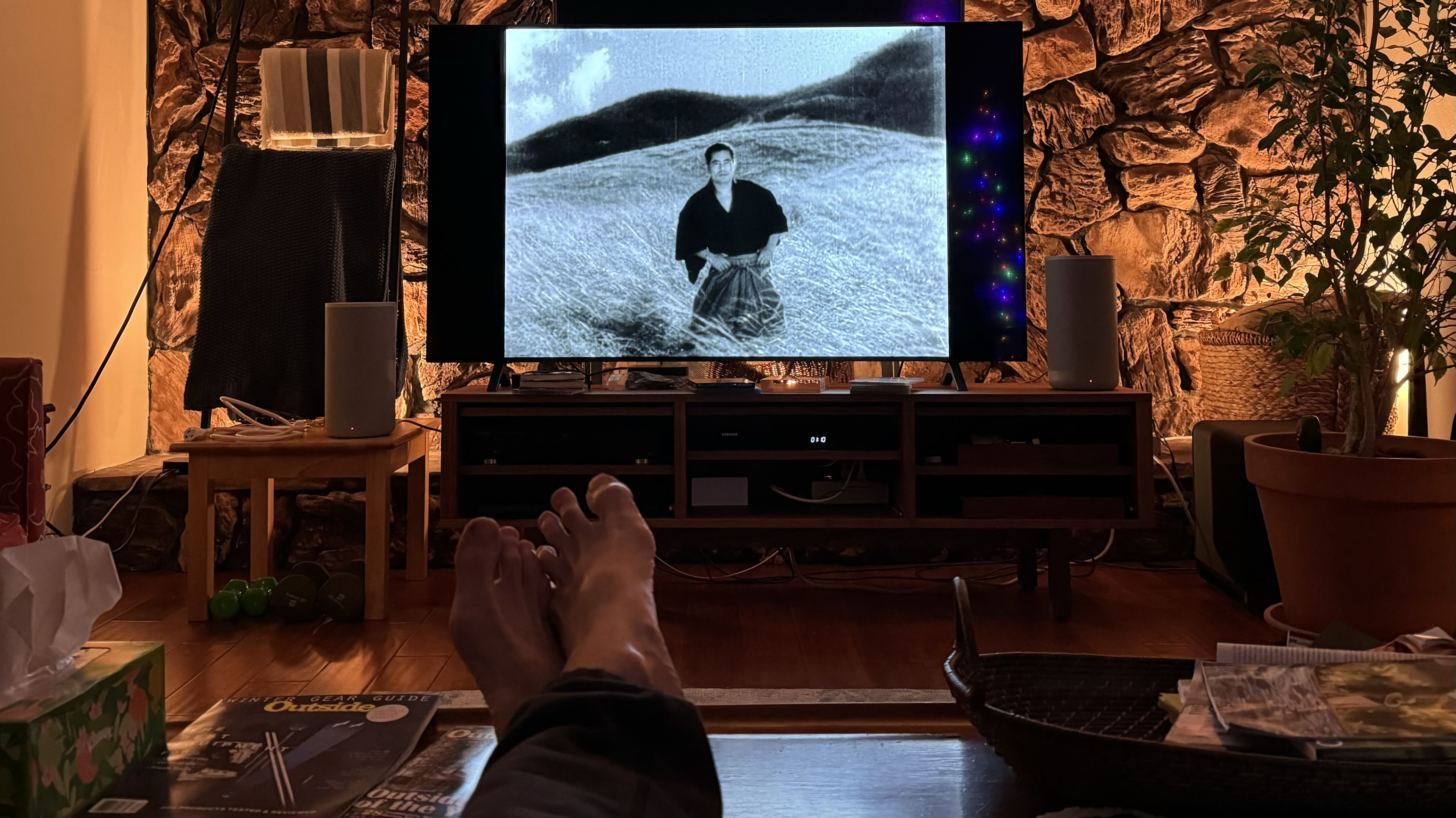 Picture of me with my feet up on the couch watching a black and white movie. On screen in Sanjuro Sugata, who is standing in a windswept field against a mountainside. He is singing. It is very beautiful and moving. The movie, I mean.
