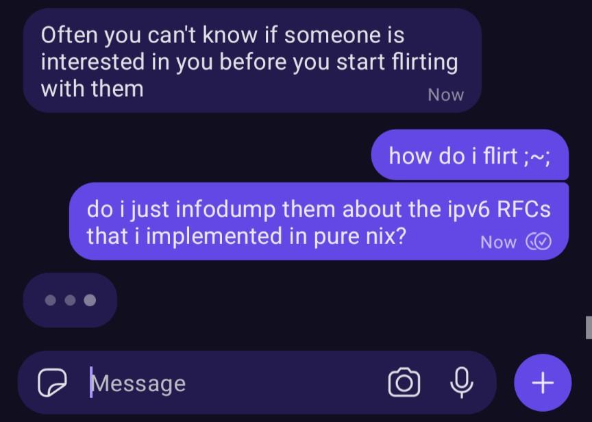 a signal conversation: them: "Often you can't know if someone is interested in you before you start flirting with them" me: "how do i flirt ;~;" "do i just infodump them about the ipv6 RFCs that i implemented in pure nix?"