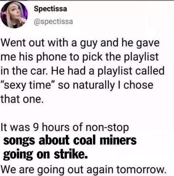 Went out with a guy and he gave me his phone to pick the playlist in the car. He had a playlist called "sexy time" so naturally I chose that one. It was 9 hours of non-stop songs about coal miners going on strike. We are going out again tomorrow.