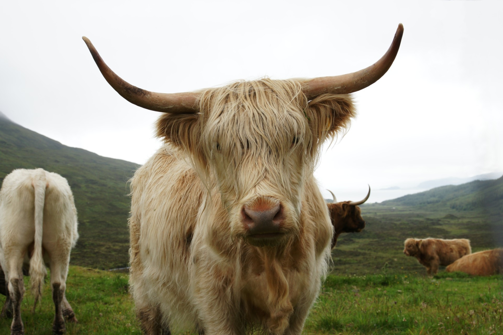 Hochlandrind mit hellen Fell (gilt als "white", ist aber eher so cremefarben-gelblich). Es guckt direkt in die Kamera. Augen sind, wie es sich gehört, natürlich von den langen Haaren quasi verdeckt. Typisch geformte Hörner, das Tier ist aber noch relativ jung, sie sind also noch nicht extrem lang. Ein Horn etwa so lang wie der Kopf inkl. Ohren breit ist. Im Hintergrund noch ein paar andere Hochlandrinder, verschiedene Fellfarben (red, dun, white), und eine typische Schottische Landschaft. Mit Hochnebenl.