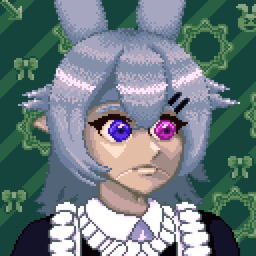 Old pixel art animation of Kata Kabun in a maid outfit talking. Its jaw is opening and closing like a wooden puppet and it blinks every now and then.