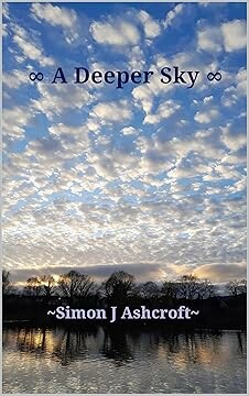 Cover of "A Deeper Sky" Blue sky dotted with broken cloud, takes up about two thirds of the image, above a lake. A line of trees is silhouetted against the evening light and reflects in the water. "A Deeper Sky" appears across the sky in dark letters. "Simon J Ashcroft is in white along the dark line of trees.