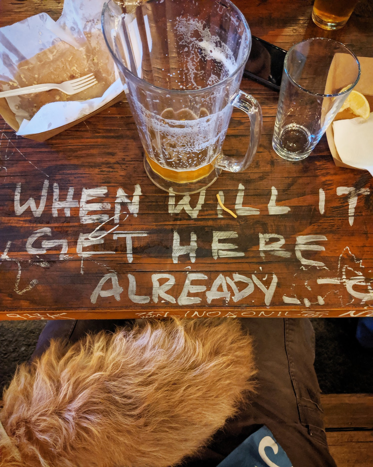 Looking down at a rough hewn picnic table on which someone has scrawled "When will it get here already". A small scruffy dog is sitting on my lap at the bottom and at the top are a food container, pitcher, and glass. The pitcher has a tad of beer at the bottom, but the food container and glass are both completely empty. I've been sitting here a while and have consumed almost everything.