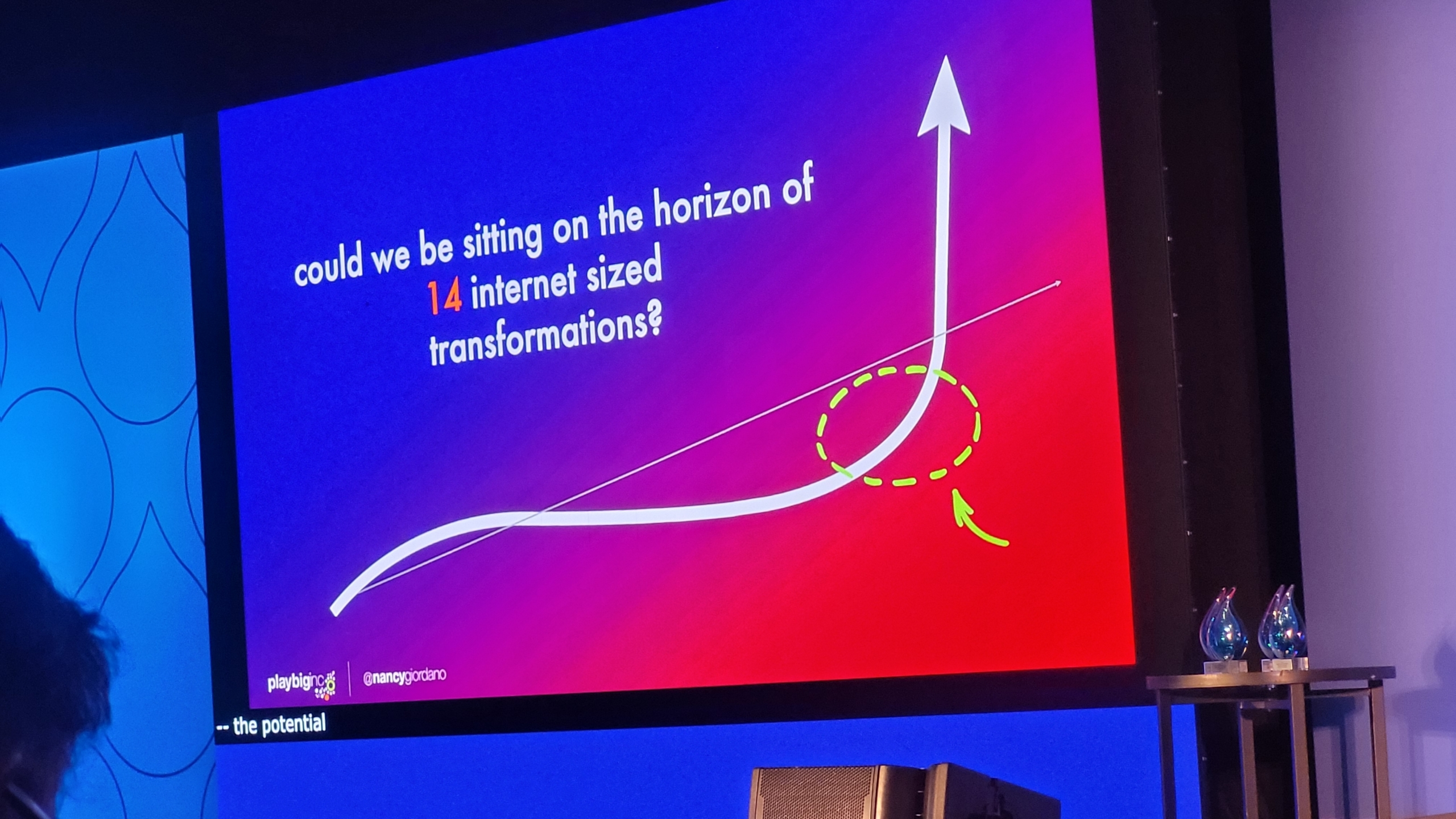 Slide from a conference presentation by Nancy Giordano who bills herself as a strategic futurist. An arrow points to the knee of an exponential curve with the text "could we be sitting on the horizon of 14 internet sized transformations". There is no dash in "internet-sized" and there is no context about how the weirdly-specific number 14 was selected.