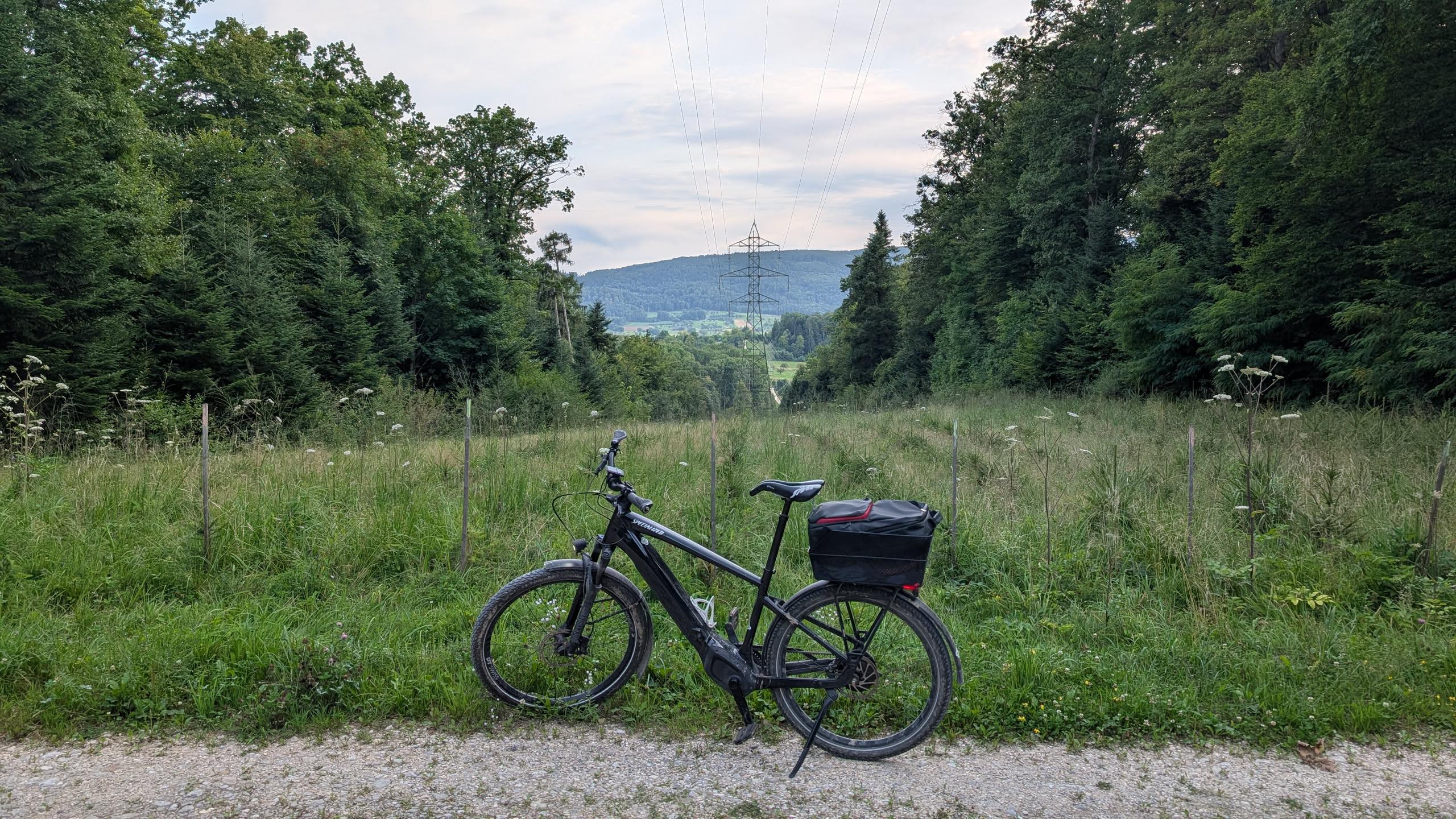 Photo of my bike on a gravel path in the woods. Behind the bike, tiny new pines grow. Overhead, power lines. A pylon can be seen in the distance.