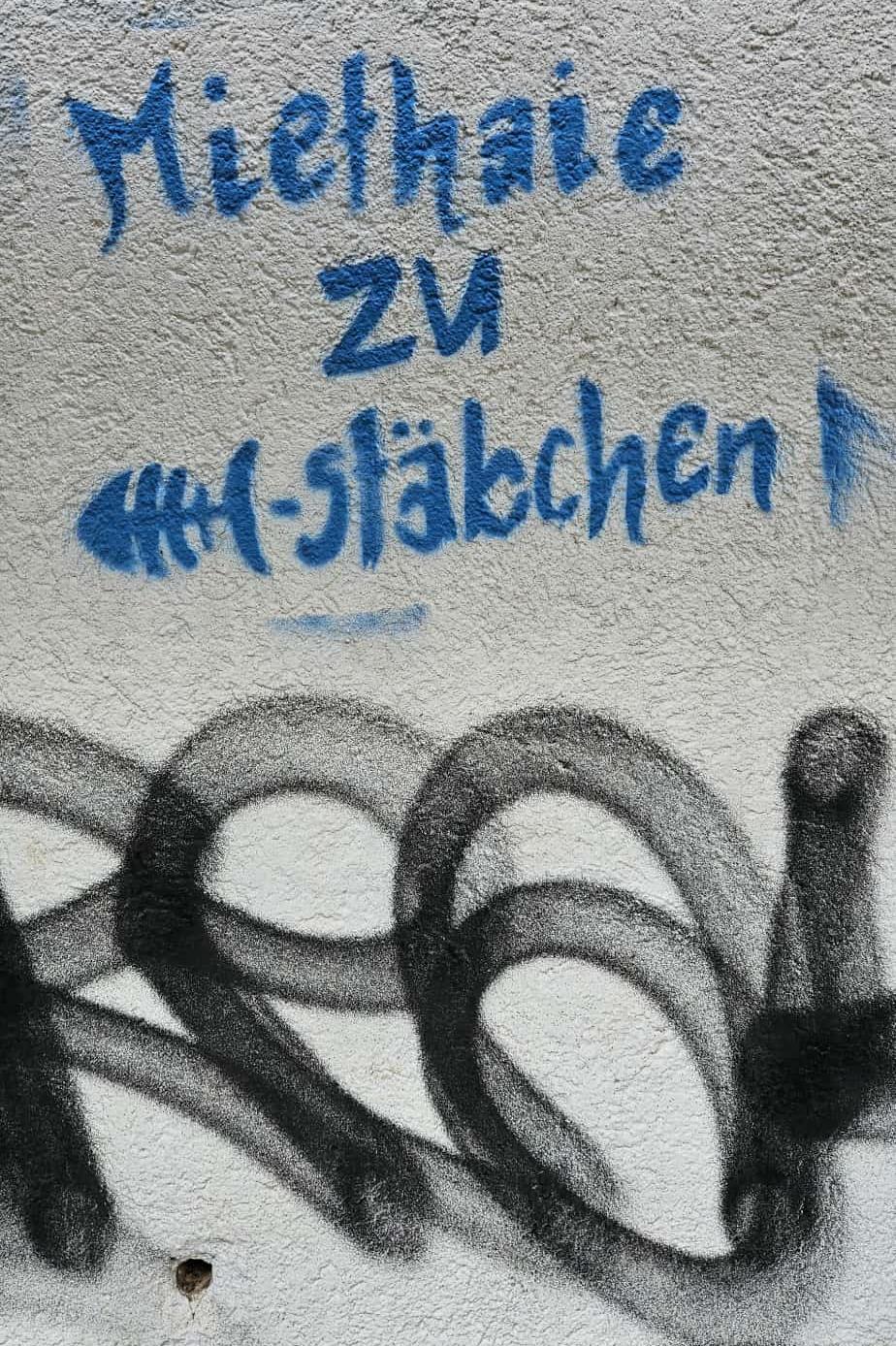 Graffitto "Miethaie zu FischstΓ€bchen" (Das Wort "Fisch" ersetzt durch ein stilisiertes Fischskelett).