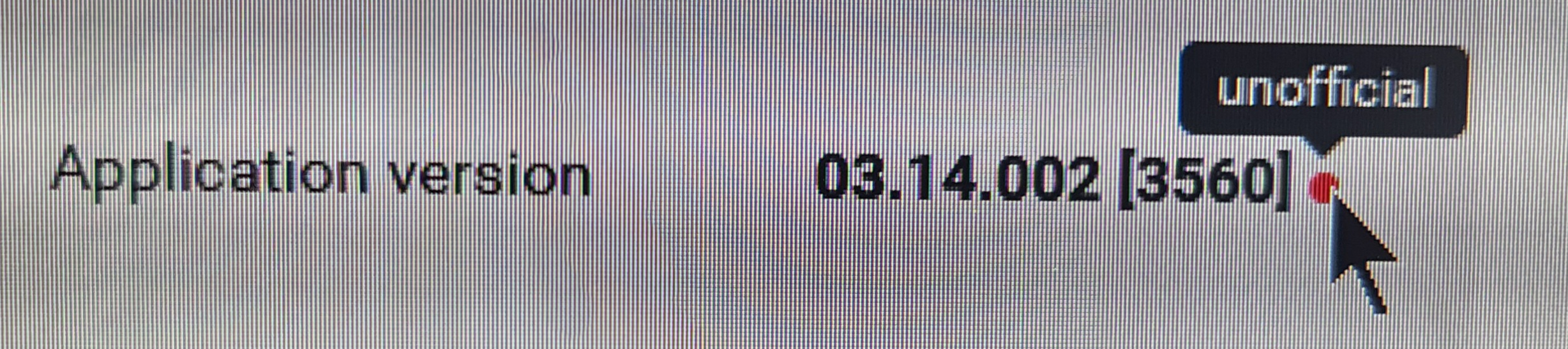 Application version: 03.14.002 [3650] with a red dot next to it. A popup says "unofficial"