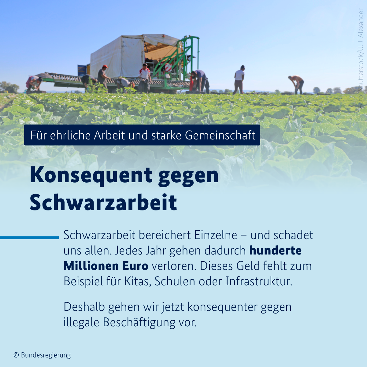 In weißer Schrift auf dunkelblauem Hintergrund steht: für ehrliche Arbeit und starke Gemeinschaft. Im Hintergrund ist ein Feld mit Salatköpfen zu sehen, auf dem Arbeiter das Gemüse ernten. Darunter steht der Text: Konsequent gegen Schwarzarbeit. Schwarzarbeit bereichert Einzelne – und schadet uns allen. Jedes Jahr gehen dadurch hunderte Millionen Euro verloren. Dieses Geld fehlt zum Beispiel für Kitas, Schulen oder Infrastruktur. Deshalb gehen wir jetzt konsequenter gegen illegale Beschäftigung vor.
