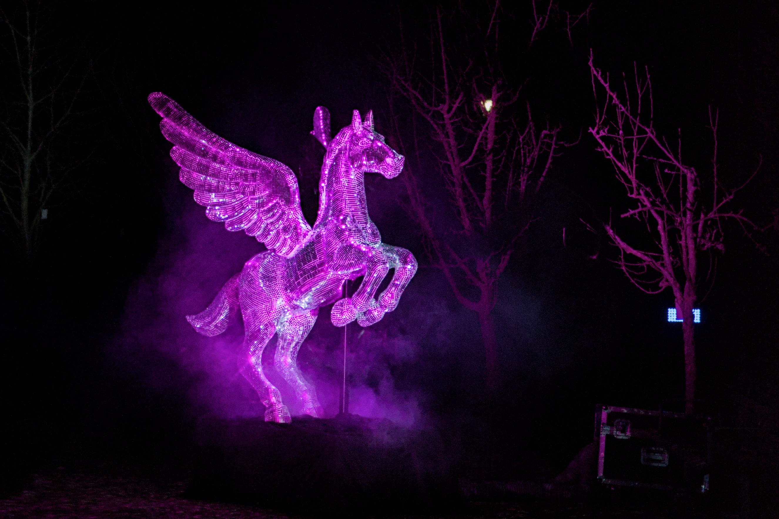 A night-time photo of a rearing disco pegasus illuminated with purple lights. Yes, you read/heard right, a disco pegasus. A pegasus (horse with wings), covered in tiny mirrors, like a disco ball. There seems to be a fog machine nearby, because some purple (because of the lights) fog seems to be rising from the ground around the pegasus, giving the whole image a majestic vibe (besides the fact that it is a purple disco pegasus, of course). Otherwise, there are a few trees illuminated in purple in the background as well. And a box of some sort. But mainly: Purple Disco Pegasus.