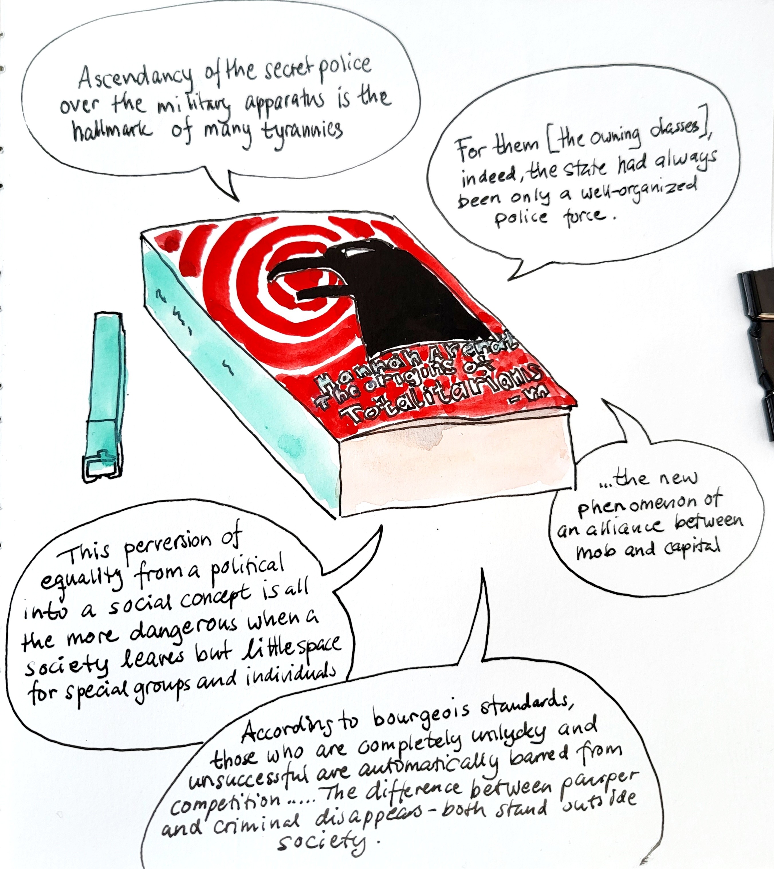 Teckning av en pocketbok och en överstrykningspenna. Boken är av Hannah Arendt. Runt om finns pratbubblor med citat.