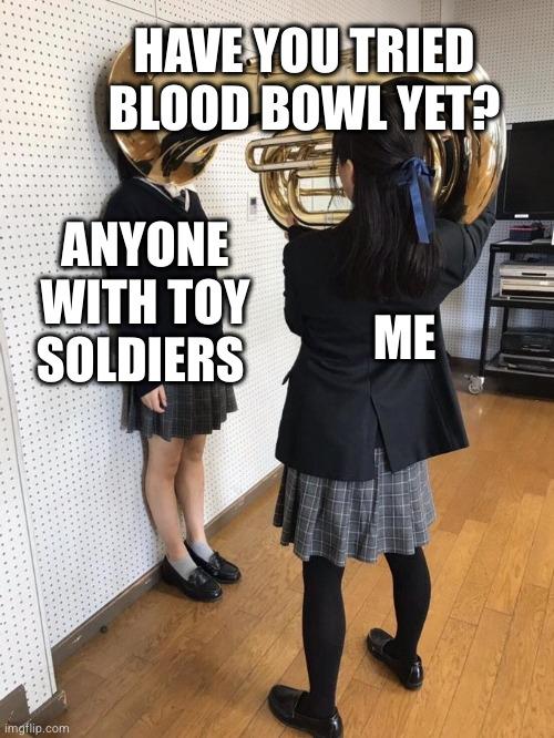 girl (captioned 'me') pinning other girl's head (captioned 'anyone with toy soldiers') against the wall with a tuba (captioned 'have you tried Blood Bowl yet?')
