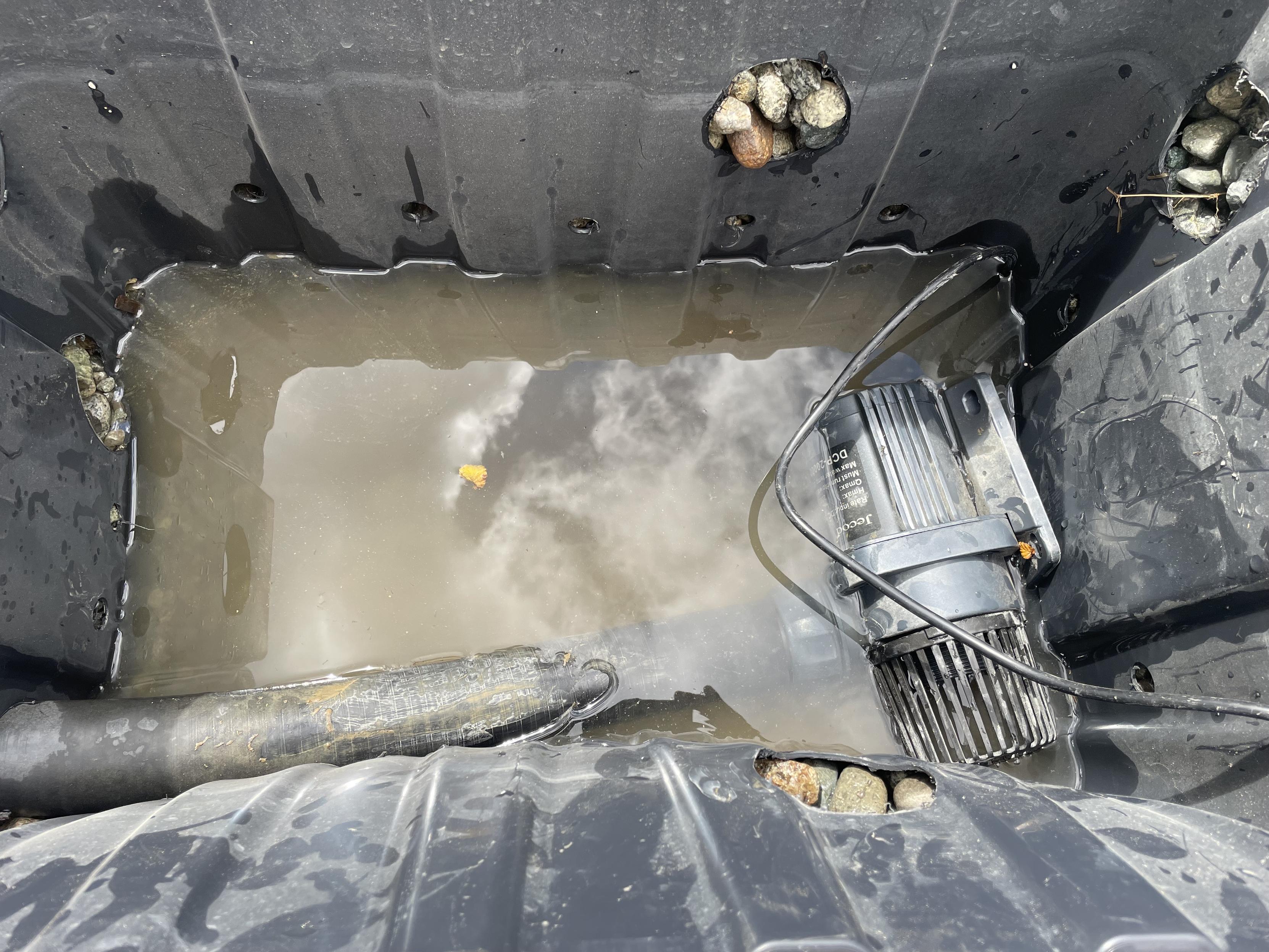 A small pump is on its side in the bottom of a black box. There is a black hose going to it.
