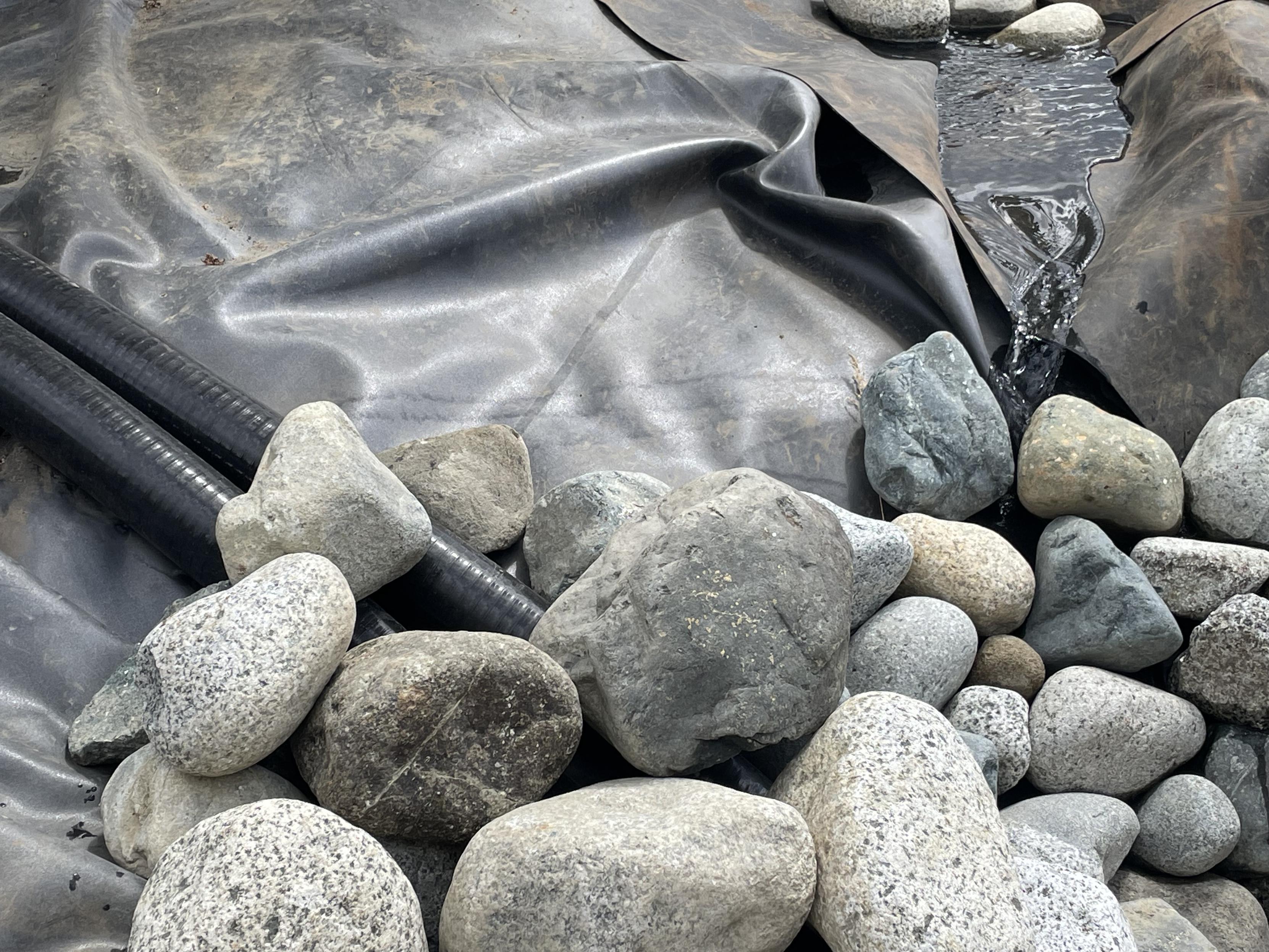 A trickle of water comes down some rubber liner into rocks in the edge of the bay. There are two large black hoses exiting on the opposite side.