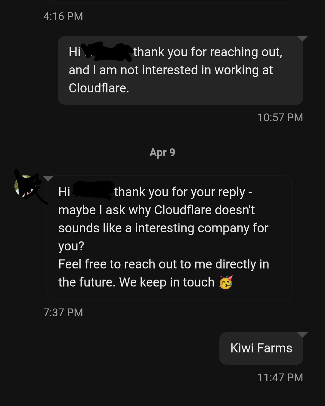 LinkedIn message exchange My message: Hi *redacted*, thank you for reaching out, and I am not interested in working at Cloudflare. 10:57 PM Apr 9 Cloudflare recruiter: Hi *redacted*, thank you for your reply - maybe I ask why Cloudflare doesn't sounds like a interesting company for you? Feel free to reach out to me directly in the future. We keep in touch 🥳 7:37 PM Me: Kiwi Farms