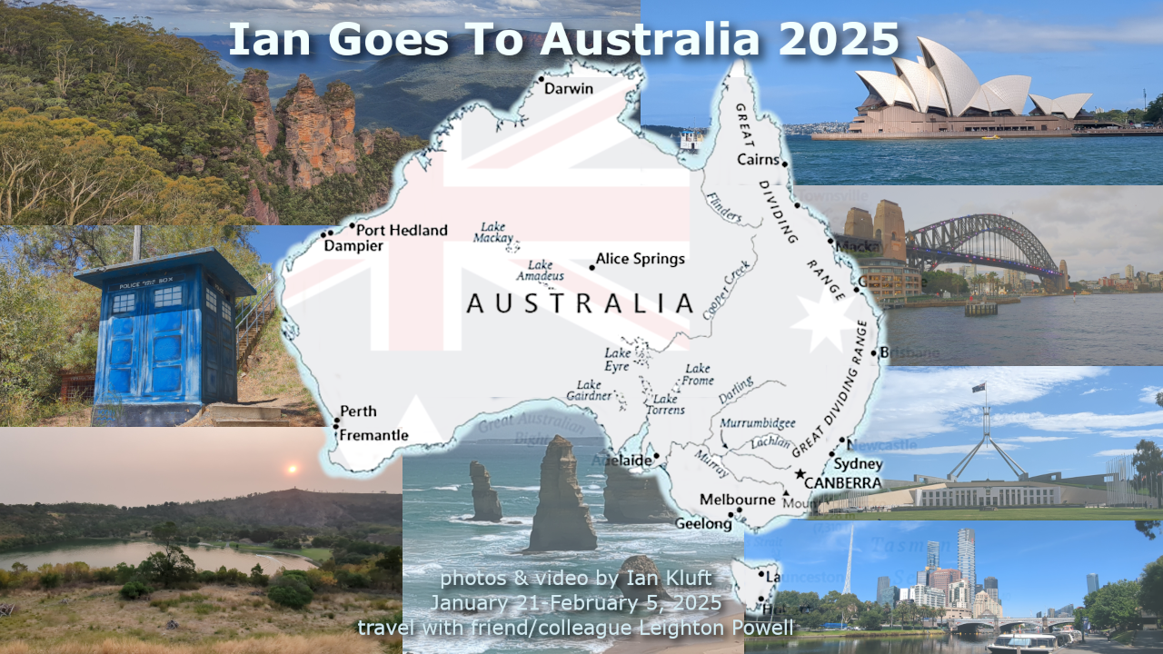 video "thumbnail" overview image title: Ian Goes to Australia 2025 center of the image has a map of Australia with the Australian flag as a background pattern images around the periphery clockwise from the top right are the Sydney Opera House, Sydney Harbour Bridge, Australian Parliament House, Yarra River waterfront in Melbourne, ocean shore with the Twelve Apostles limestone formations along the Great Ocean Road, the crater lake in the volcano at the town of Mt Gambier, an artistic replica of Doctor Who's Tardis in Canberra, and the Three Sisters rock formation in Blue Mountains National Park. Photos and video thumbnail image by Ian Kluft