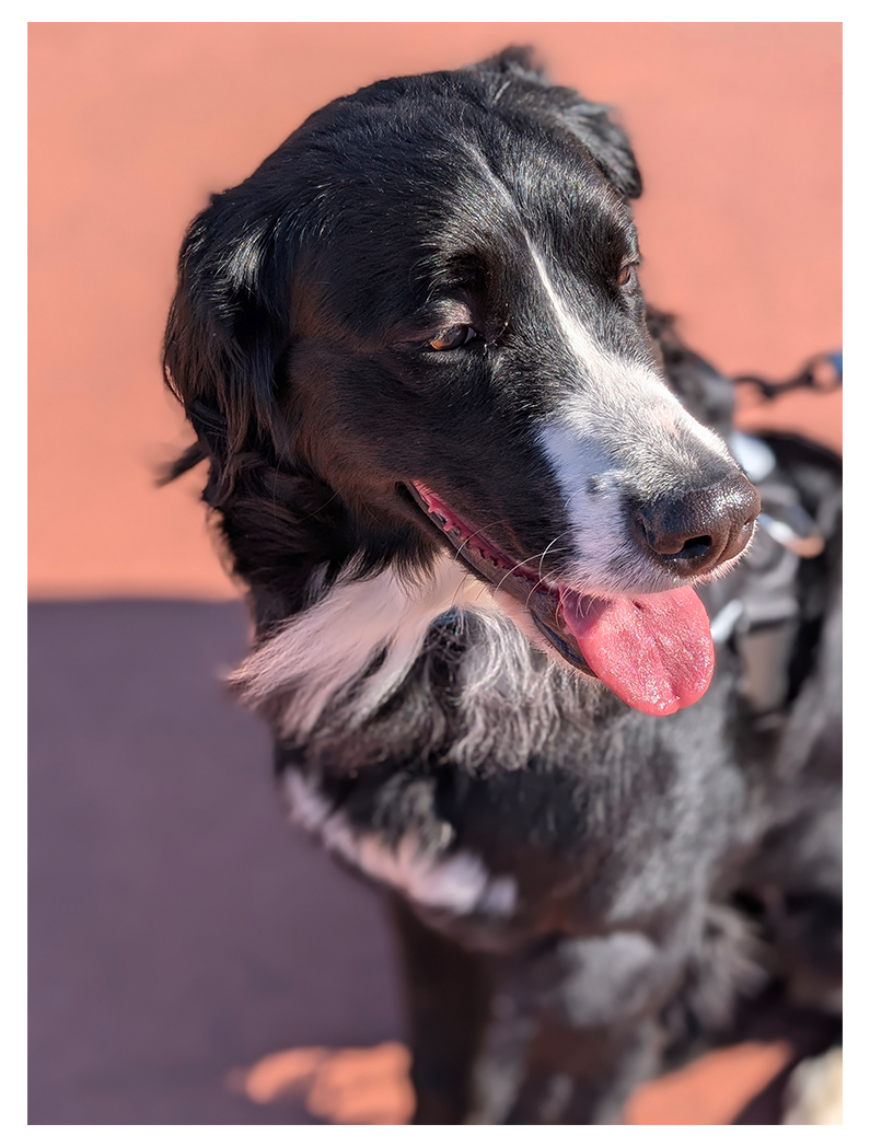 high angle view of a black dog with white markings sitting on an orange outdoor surface, looking left, mouth open, smiling.
