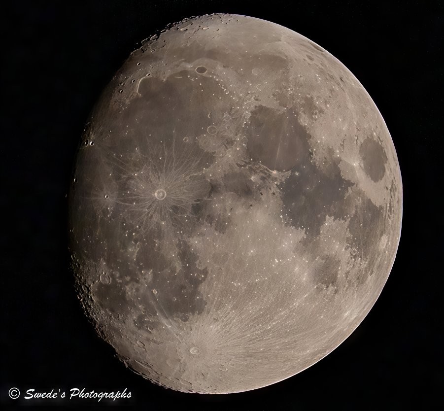 "The Moon fills the frame in stunning clarity, its cratered surface etched with the scars of ancient collisions and cosmic time. Each crater tells a story—some small and shallow, others vast and deep, with bright rays of ejecta radiating outward like frozen explosions. The texture of the lunar surface is rough and pitted, resembling weathered stone or the surface of a forgotten planet, untouched by wind or water. Shadow and light play across the terrain, revealing ridges, basins, and subtle variations in elevation. The image captures the Moon not as a smooth orb in the sky, but as a rugged, complex world—silent, airless, and hauntingly beautiful. Its grayscale palette enhances the sense of timelessness, as if the Moon exists outside the reach of seasons or decay. The photograph, signed “Swede’s Photographs” in the bottom left corner, offers more than a view—it invites contemplation. This is Earth’s only natural satellite, seen not as a distant glow, but as a textured relic of the solar system’s ancient past." - Copilot