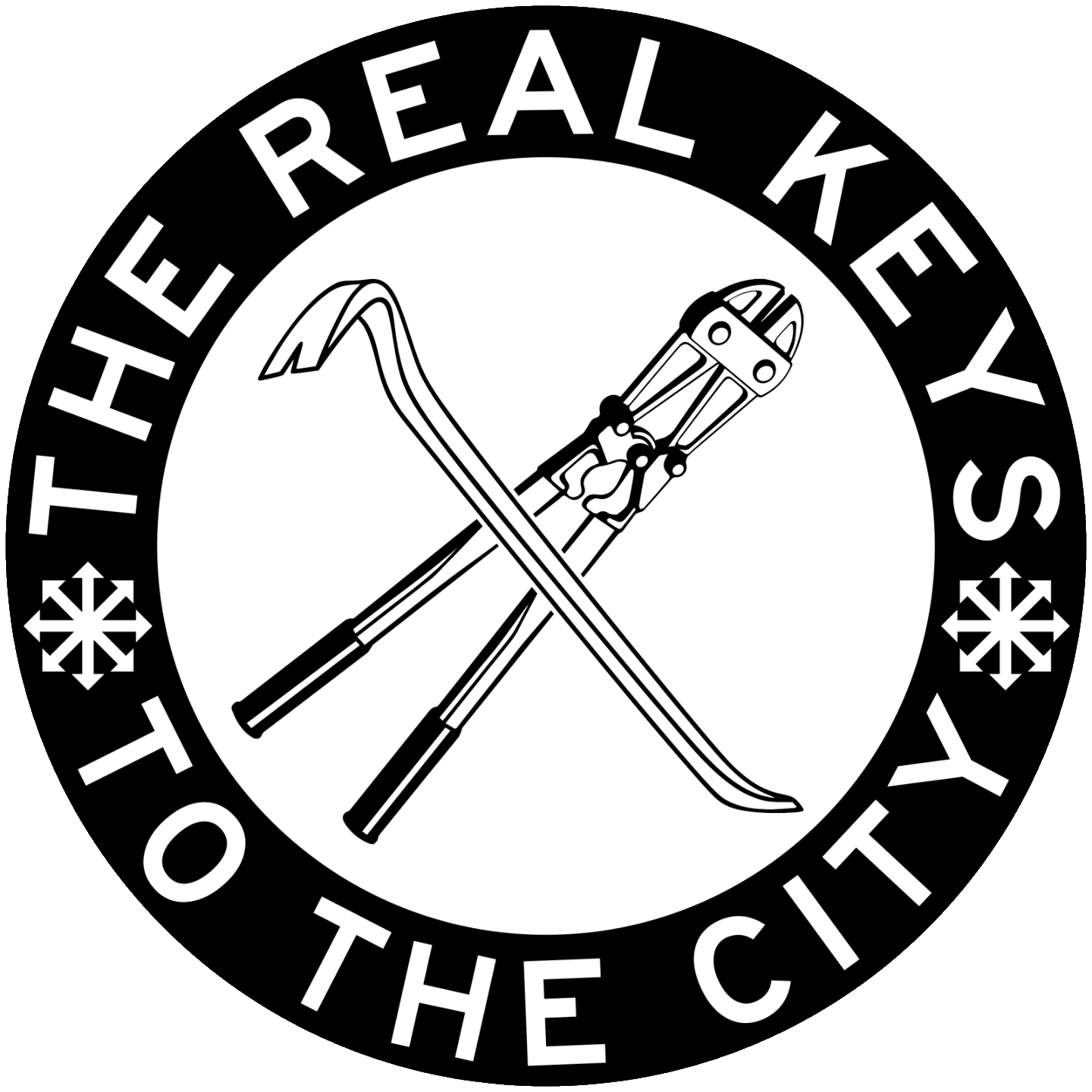 Transparent image with circular logo that reads "The real keys to the city". In the middle, a crowbar and bolt cutters form an X