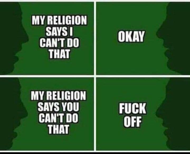 "My religion says I can't do that" "okay" "My religion says you can't do that" "fuck off"