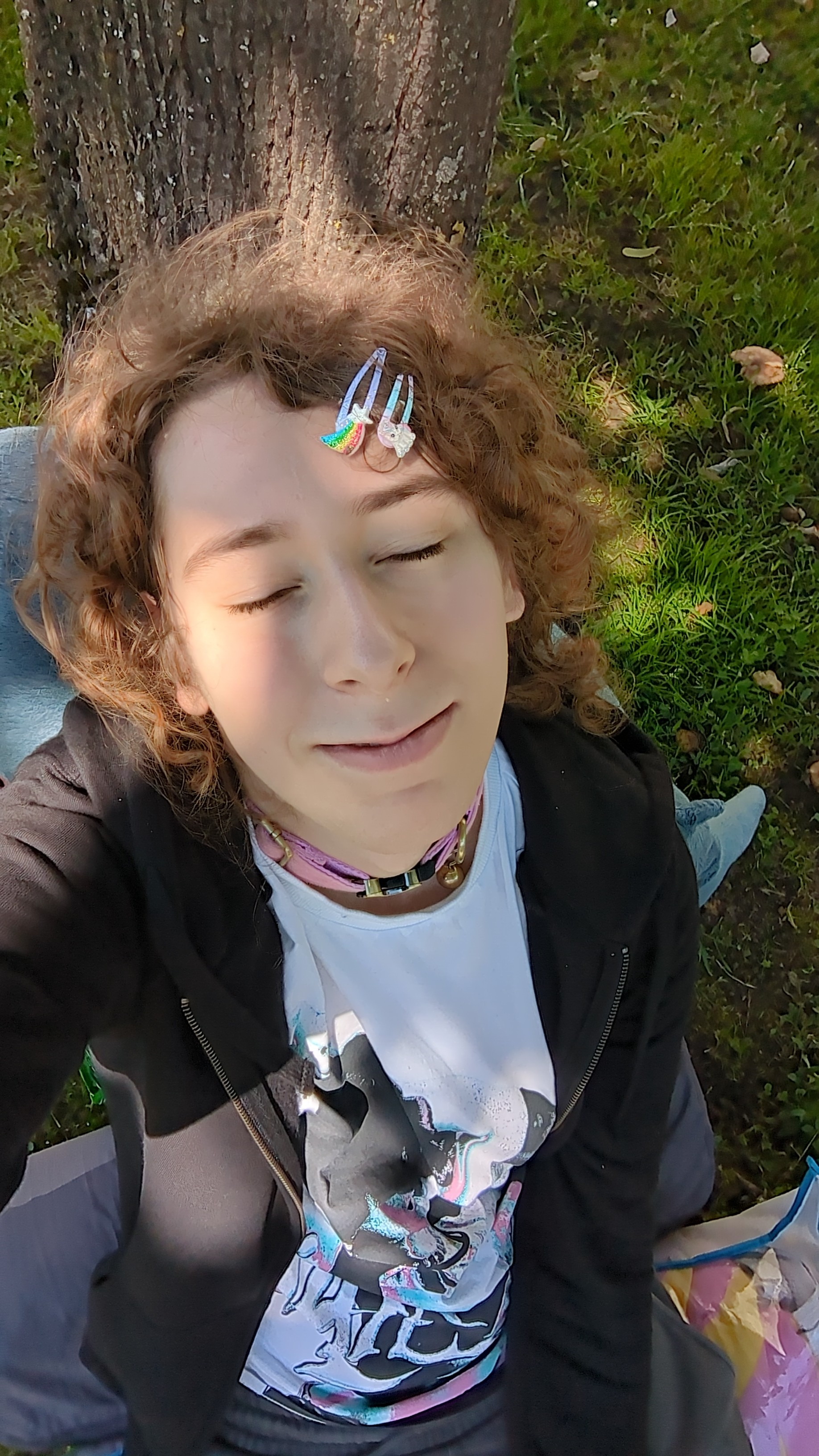 alina sitting/leaning against a tree, enjoying the sunny and slightly windy weather breeze that is tickling across her face. she's wearing cute hairclips and a collar
