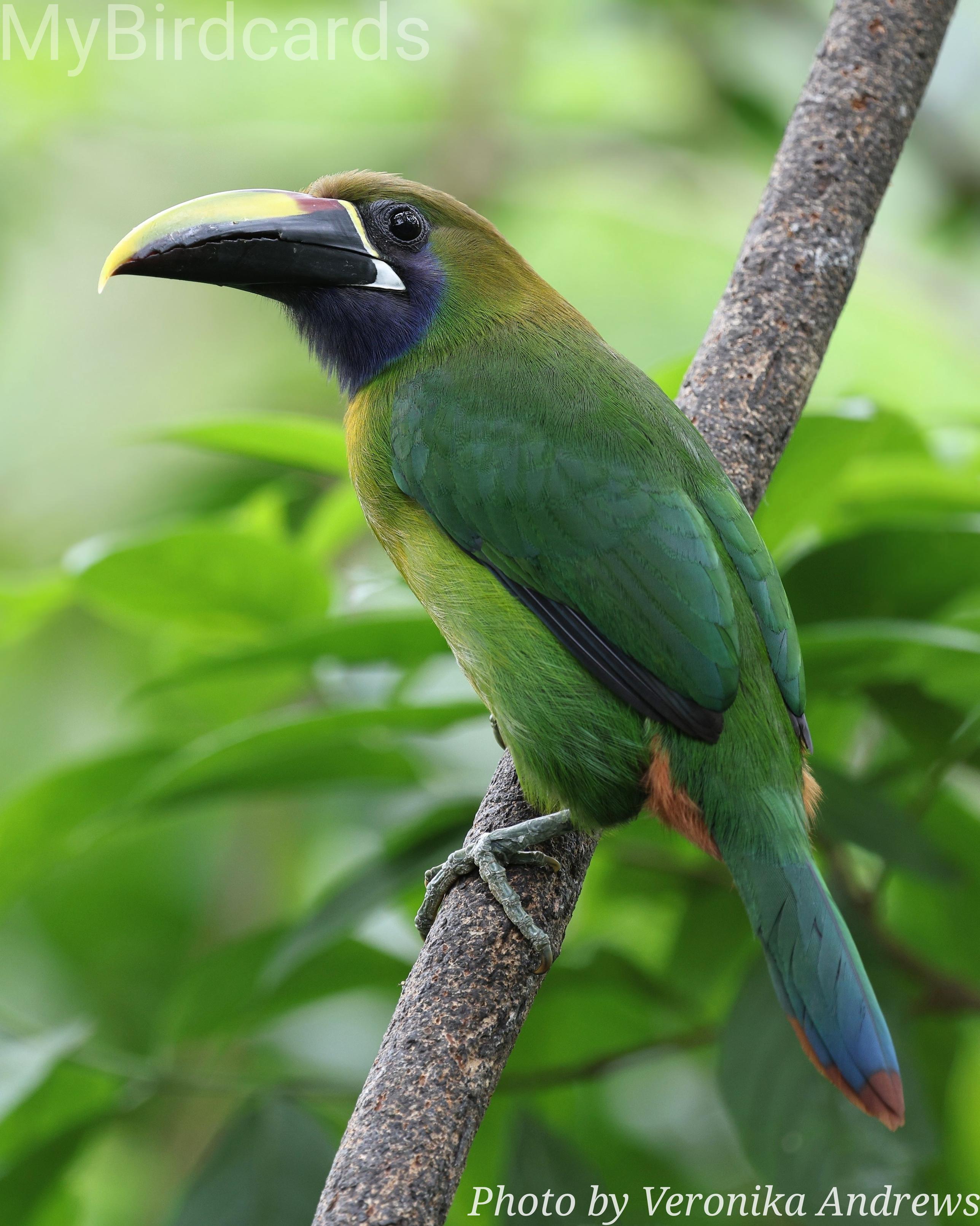 "I'm a relatively small species of toucan found in the montane forests of southern Mexico and Central America. My plumage is primarily a rich and vibrant shade of green, which gives me my common name. I have a striking yellow and black beak with a vertical white strip at its base. My chestnut-tipped tail fades from green to blue. I often perch in the canopy, where I feed on fruits and insects. My call is a series of loud, sharp "rrep-rrep-rrep" sounds." 2.5 Flash (Edited) What bird am I? 📷: Photo by Veronika_Andrews via Pixabay