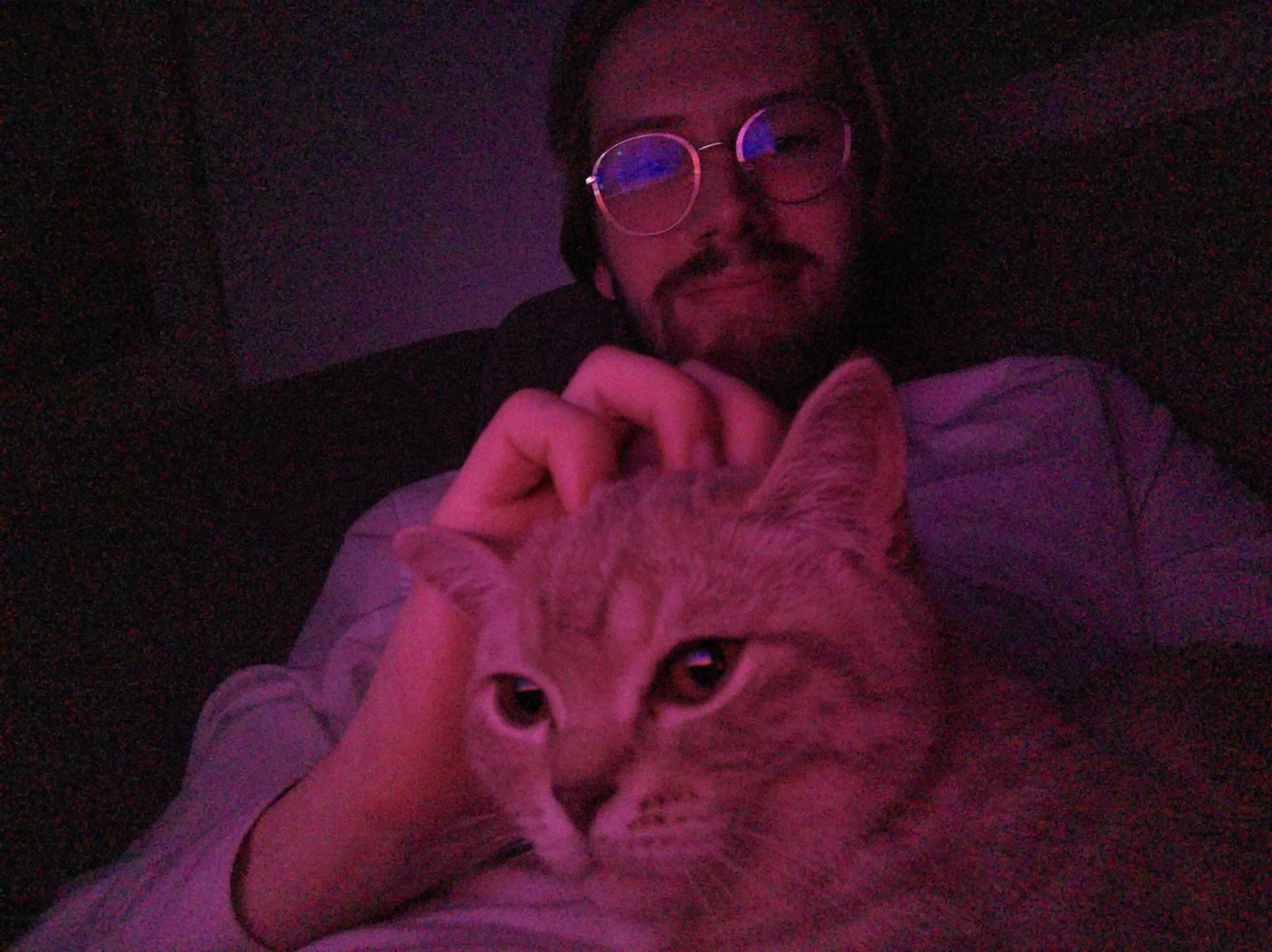A picture of a little cat being pet by Erik Uden whilst lying on his stomach and both being illuminated by red light