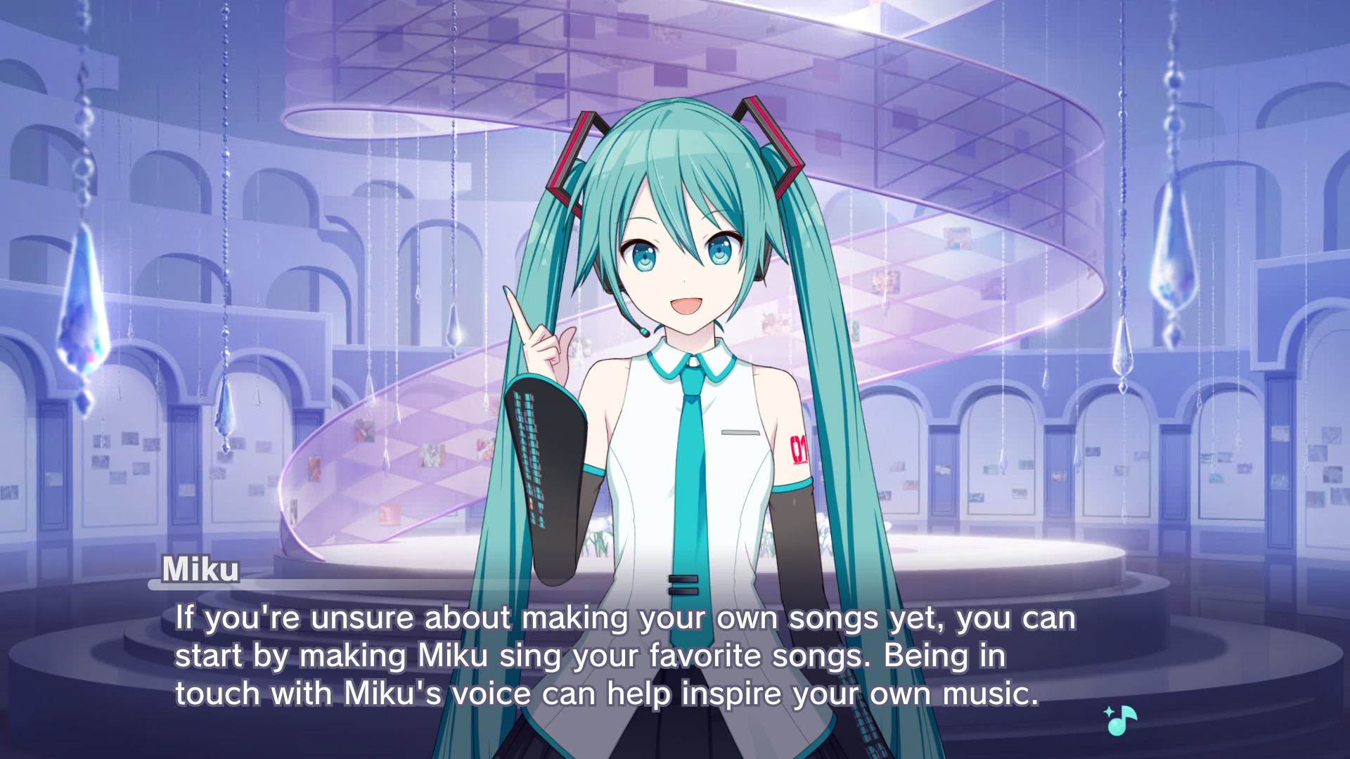 Made from Project Sekai's story board, in an abstract elegant spiral room, Hatsune Miku says "If you're unsure about making your own songs yet, you can start by making Miku sing your favorite songs. Being in touch with Miku's voice can help inspire your own music."