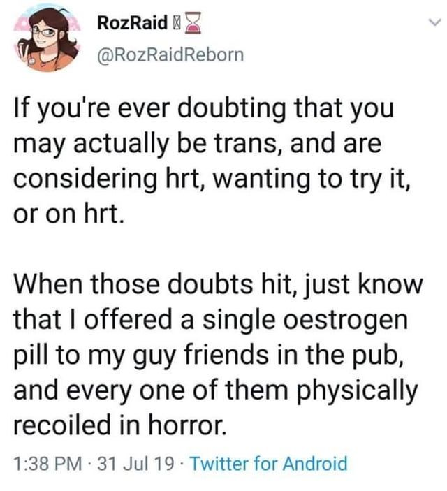 a twitter post reading: if you're ever doubting that you may actually be trans, and are considering hrt, wanting to try it, or on hrt. when those doubts hit, just know that i offered a single oestrogen pill to my guy friends in the pub, and every one of them physically recoiled in horror.