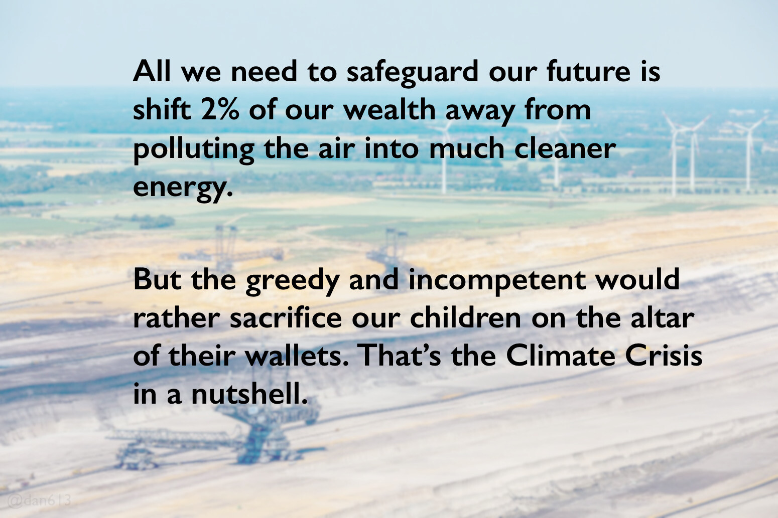 Text on image. Image is a surface mine, with wind turbines in the background. Text: All we need to safeguard our future is shift 2% of our wealth away from polluting the air into much cleaner energy. But the greedy and incompetent would rather sacrifice our children on the altar of their wallets. That's the Climate Crisis in a nutshell.