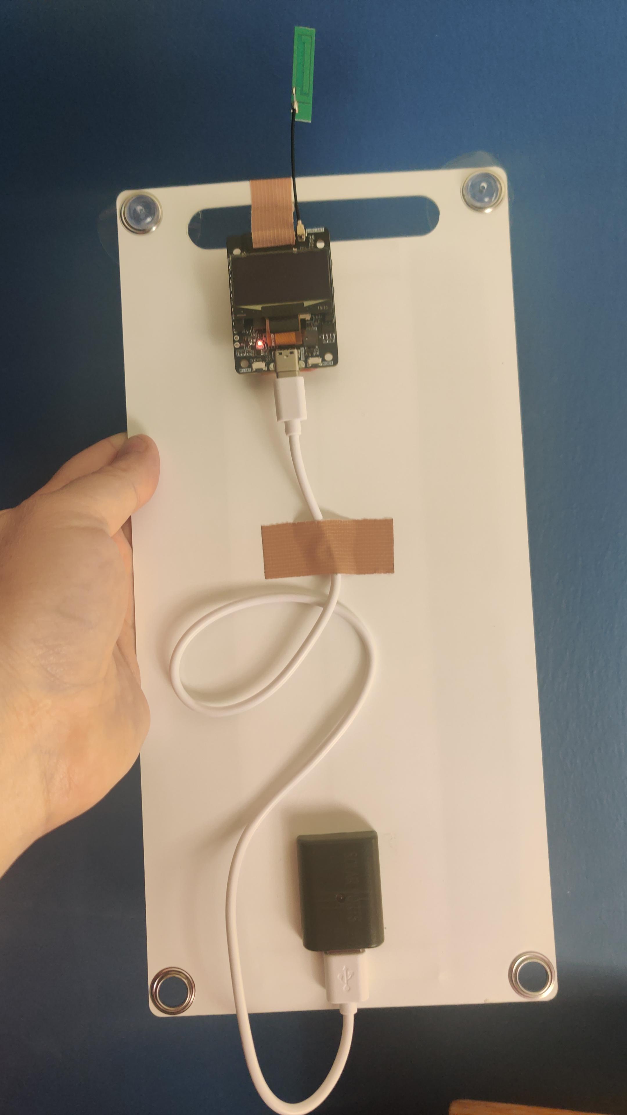 The back of the node, showing a small esp32 LoRa board attached to the back of a solar panel with cloth tape. The solar panel is about eight fingers by ⅔ cubit in size.