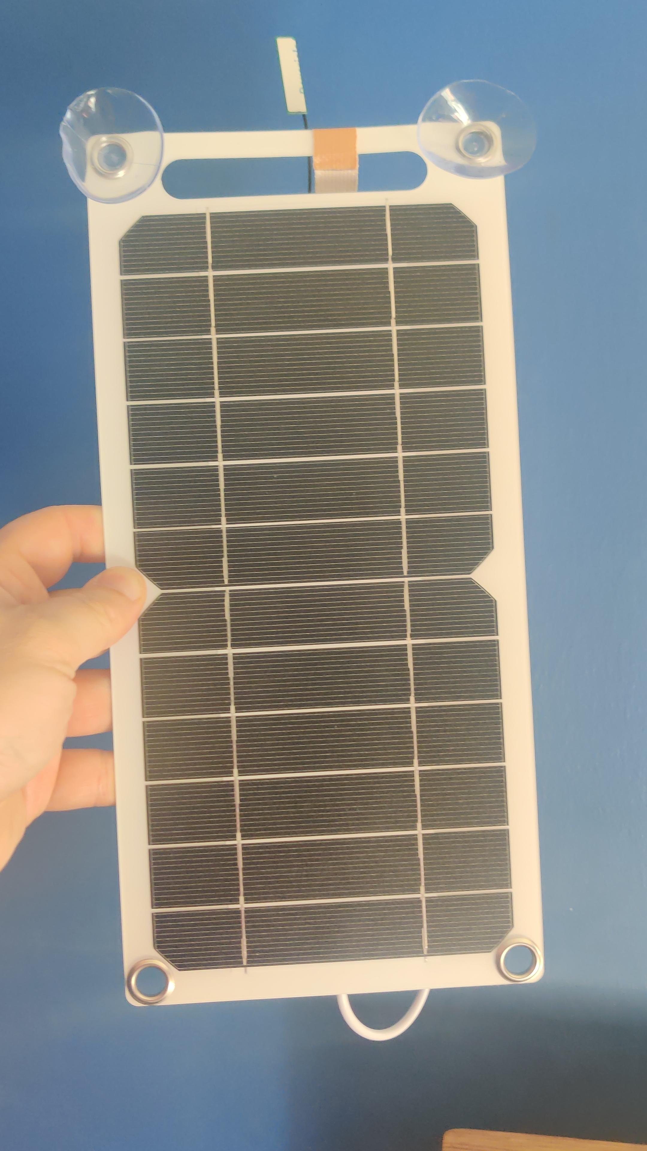 The front of the solar panel. The world's least good antenna can be seen poking from the top. There are suction cups to allow it to be attached to a window.