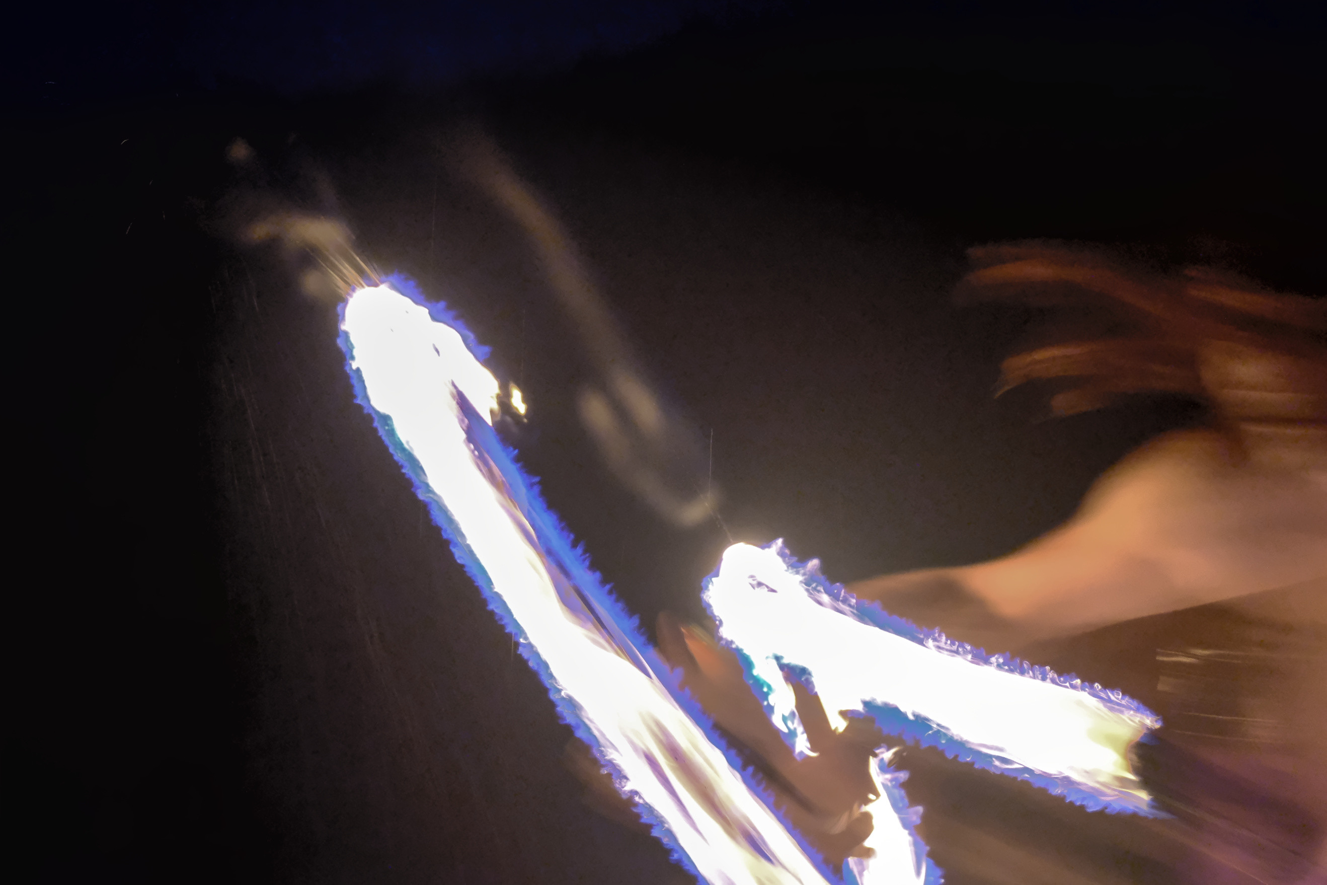 A very blurry person with very blurry fire from a long exposure relative to his motion. His hair looks like interesting brown snakes against a black background