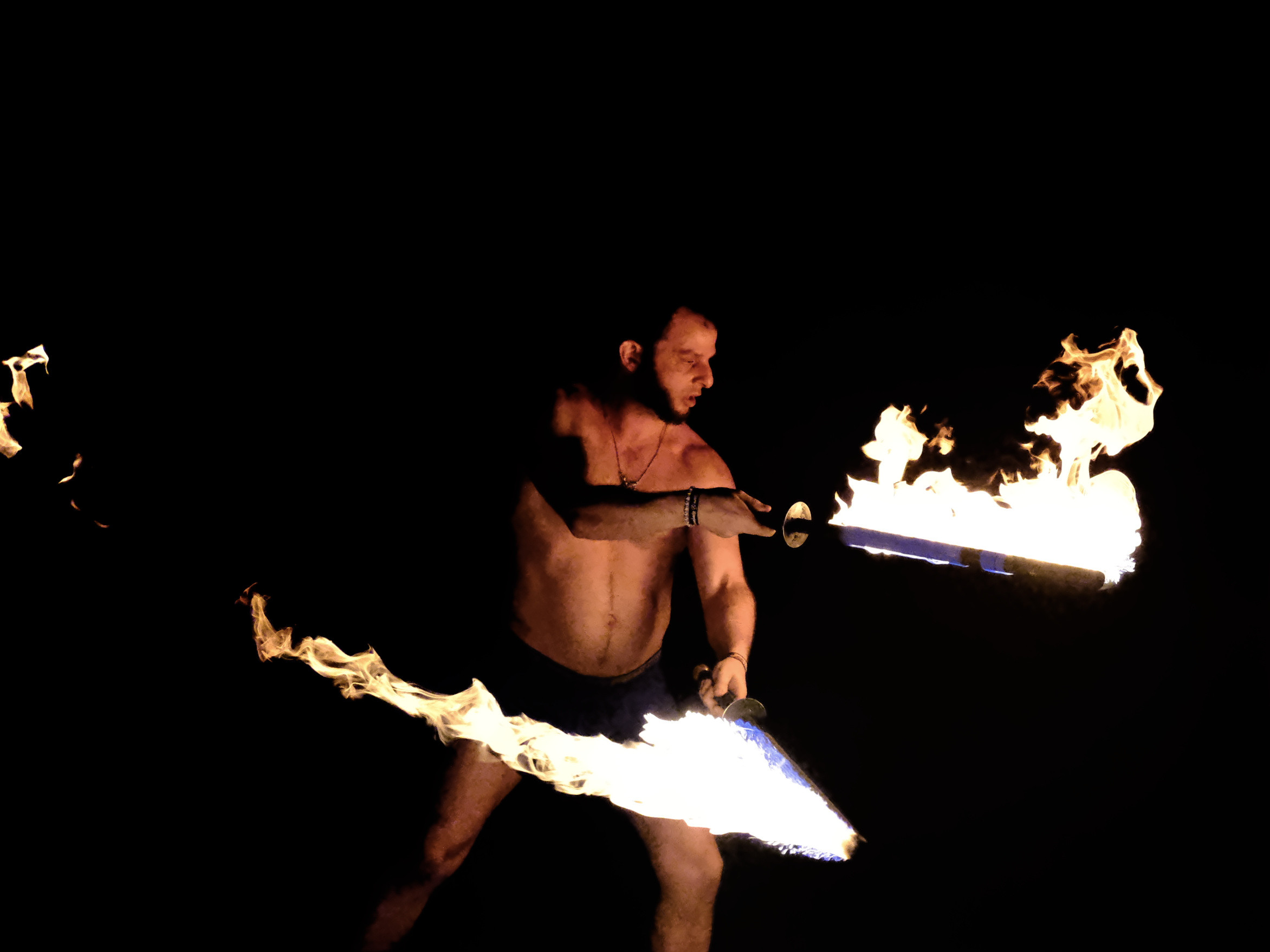 A man with an angular face and prominent, bold nose, wearing only shorts, wields two flaming swords, each pointing in a different direction. His red-orange skin (reflecting the flames) stands out against a pitch-black background.
