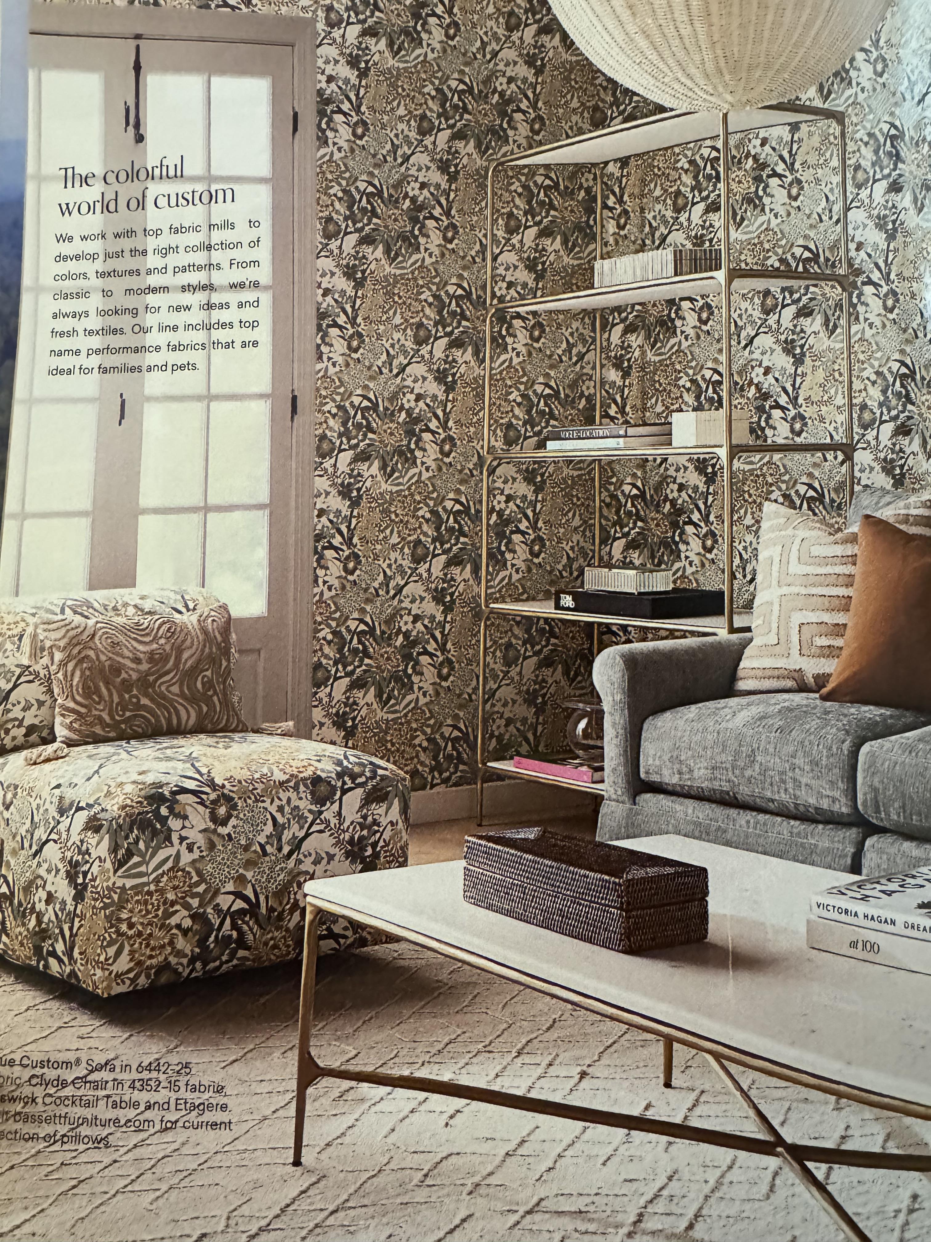A page from a Bassett Furniture catalog, showing a large-scale floral print on wallpaper and upholstered chair. It is, perhaps, a lot of one pattern for a room, and hearkens back some decades to when this kind of "matchy" style was in style, as apparently they are trying to make happen again.