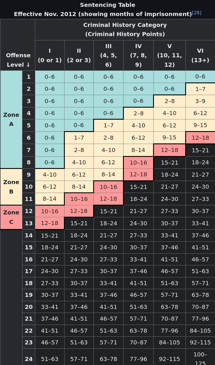 Wikipedia chart Sentencing Table Effective Nov. 2012 (showing months of imprisonment) The X axis: "Criminal History Category (Criminal History Points)", from category I (0 or 1) to category VI (13+) The Y axis: Offense Level, with rows for each number 1 through 24 (rest of table not shown), with "Zone A", "Zone B", "Zone C" marked from 1–8, 9–11, 12–13 resp. The color of Zone A etc. extends out into the cells and recedes in a staircase pattern, i.e. higher Criminal History Categories leave e.g Zone B at lower Offense Level than lower categories Values in Zone A are all "0–6" (months) Values in Zone B range from "1–7" to "9–15" Values in Zone C range from "10–16" to "12–18" Values in the rest of the chart get progressively larger