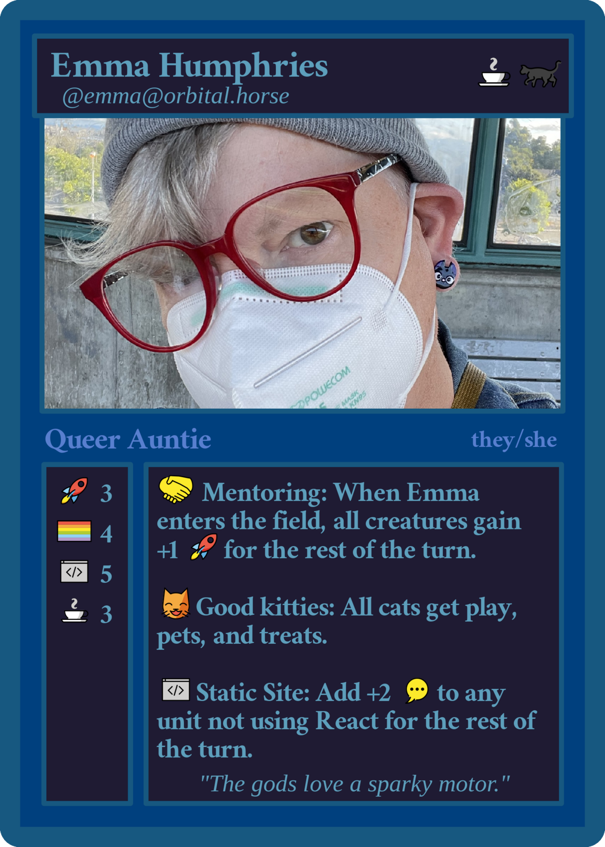 A mocked up magic card: Line one: Emma Humphries, coffee emoji, black cat emoji Line two: @emma@orbital.horse Image: A white femme wearing red glasses, a grey watch cap, face mask, with grey hair, and black cat earrings Line Three: Queer Auntie, they/she Column One: rocket emoji: 3, pride flag: 4, code editor: 5, coffee: 3 Column Two: handshake emoji, Mentoring: When Emma enters the field, all creatures gain, +1 rocket emoji for the rest of the turn; smiling cat, eyes closed emoji, Good kitties: All cats get play, pets, and treats; Code editor emoji: Static Site: Add +2 Chatting/Commenting emoji to any unit not using React[.js] for the rest of the turn. Catch phrase: "The gods love a sparky motor"