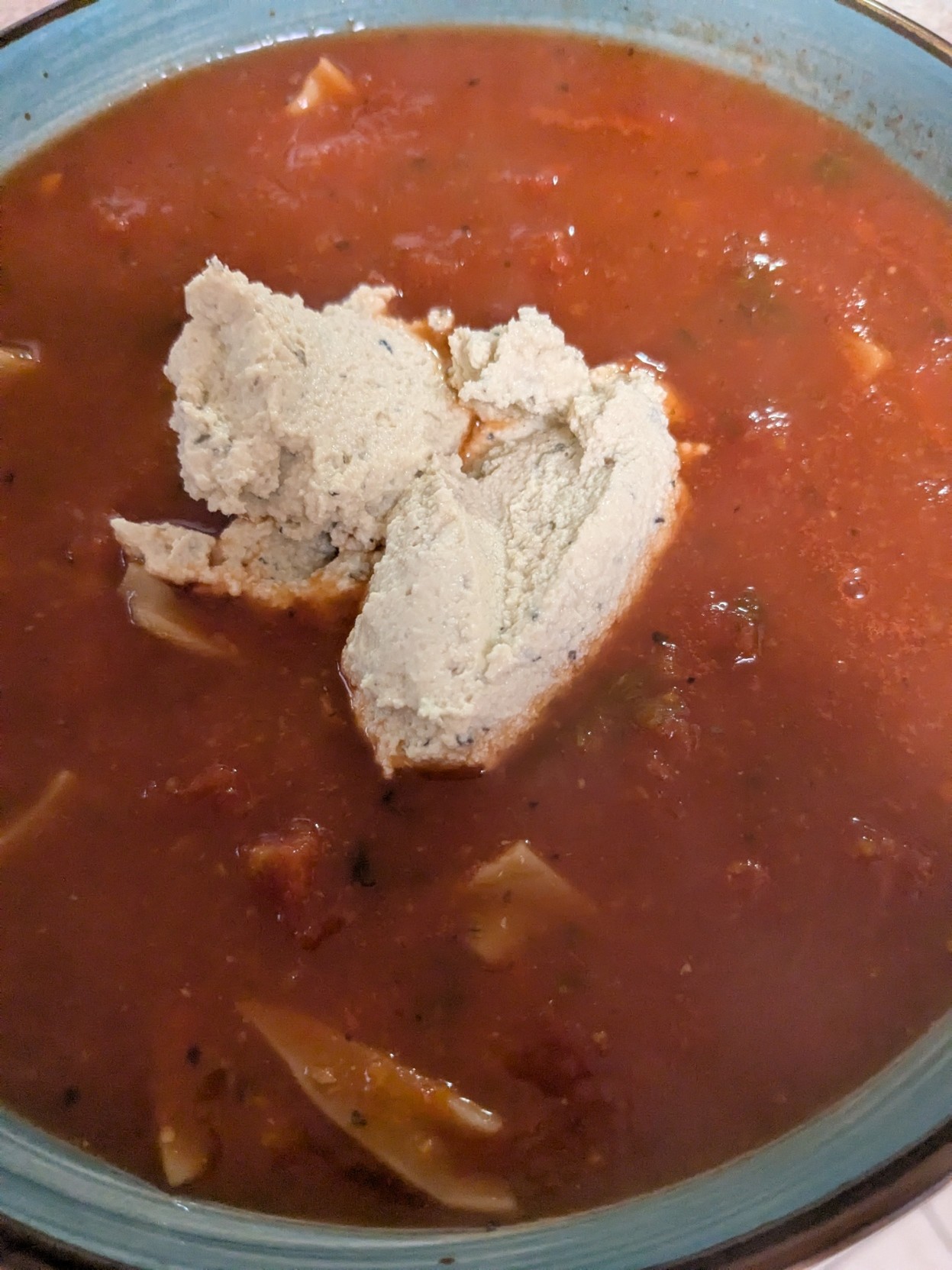 A bowl of rich looking tomato soup with a large dollop of fake ricotta in the middle
