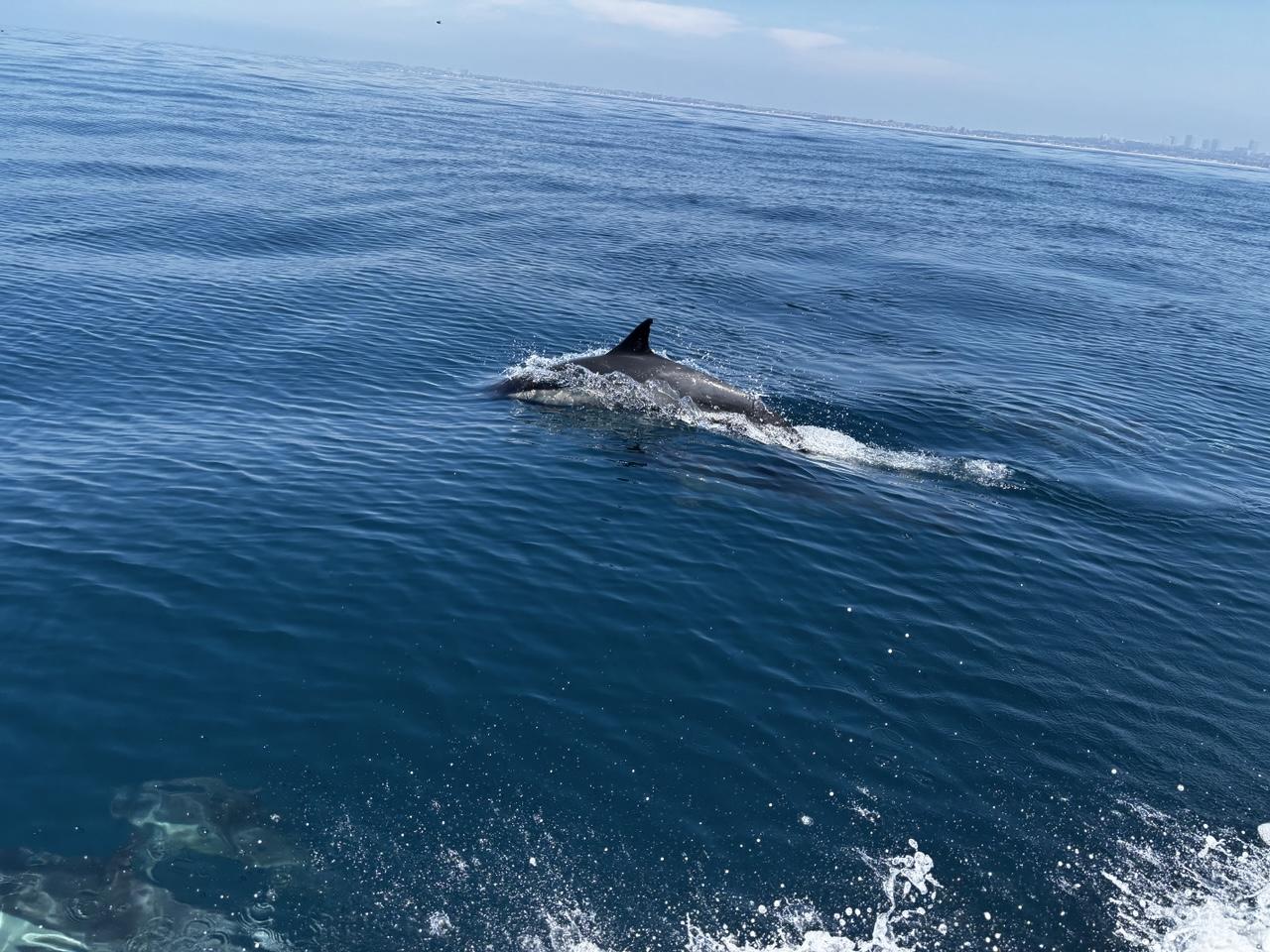 Dolphin in the ocean. Blue water, blue sky, grey dolphin.