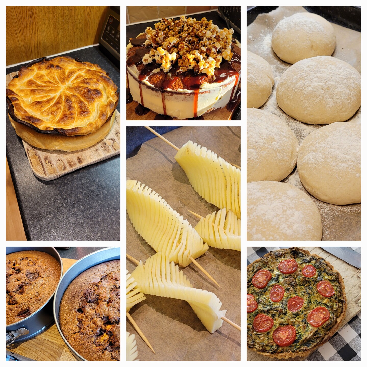 Food collage.... A closed pie containing mac'n'cheese with 'bacon' bits and brocolli (it was ridiculous) Toffee popcorn birthday cake with popcorn on the top and toffee dribbling down the side, lit by a ray of sunlight.... FROM THE HEAVENS Baps, pre-cooked Two half's of a double layer choc chip cake before assembly Helix-cut potato on sticks before being brushed with garlic and parsley oil and roasted A silken tofu spinach and tomato quiche 😋