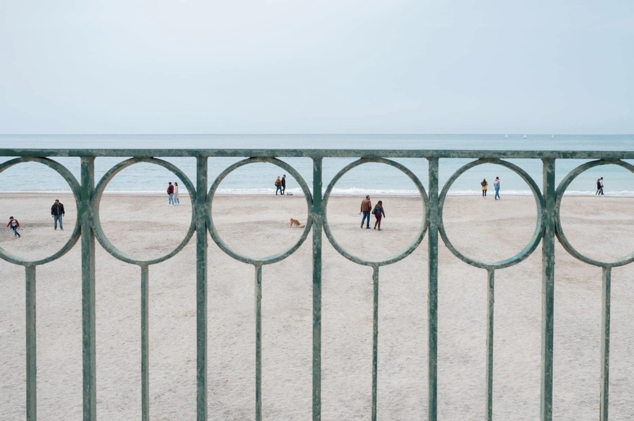 des gens sur la plage, chacun dans un espace circulaire dΓ©limitΓ© par le motif de la balustrade du remblai