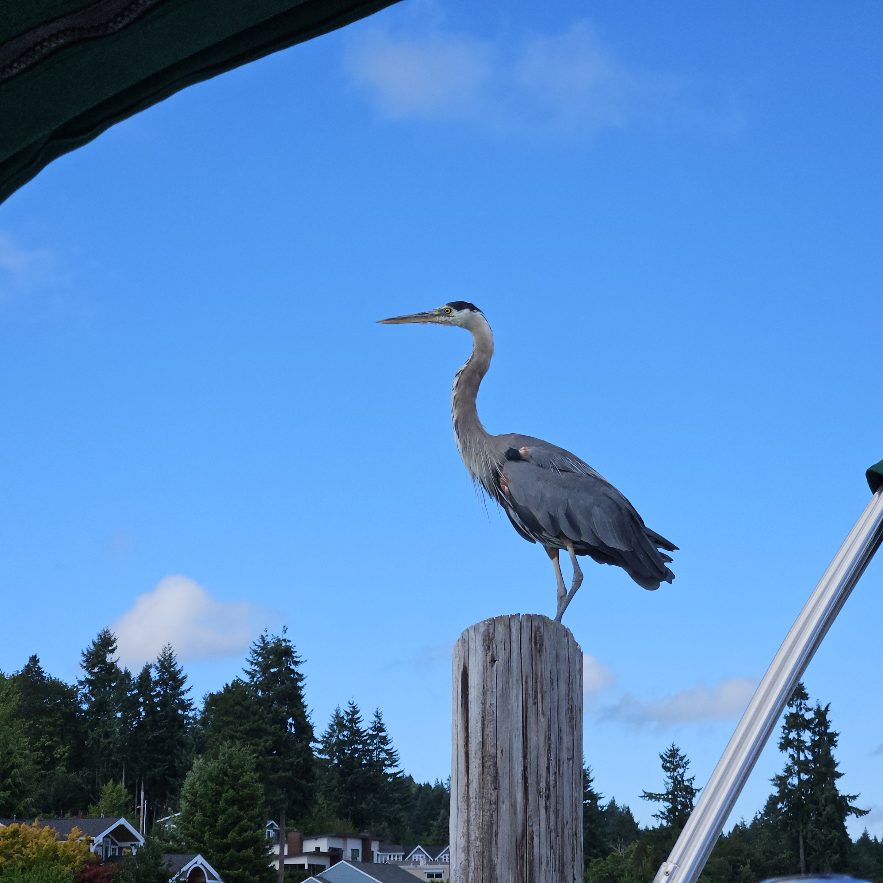 a heron standing on a post next to a boat I am on.