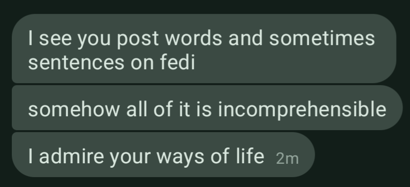 series of chat messages that read "I see you post words and sometimes sentences on fedi, somehow all of it is incomprehensible, I admire your ways of life"