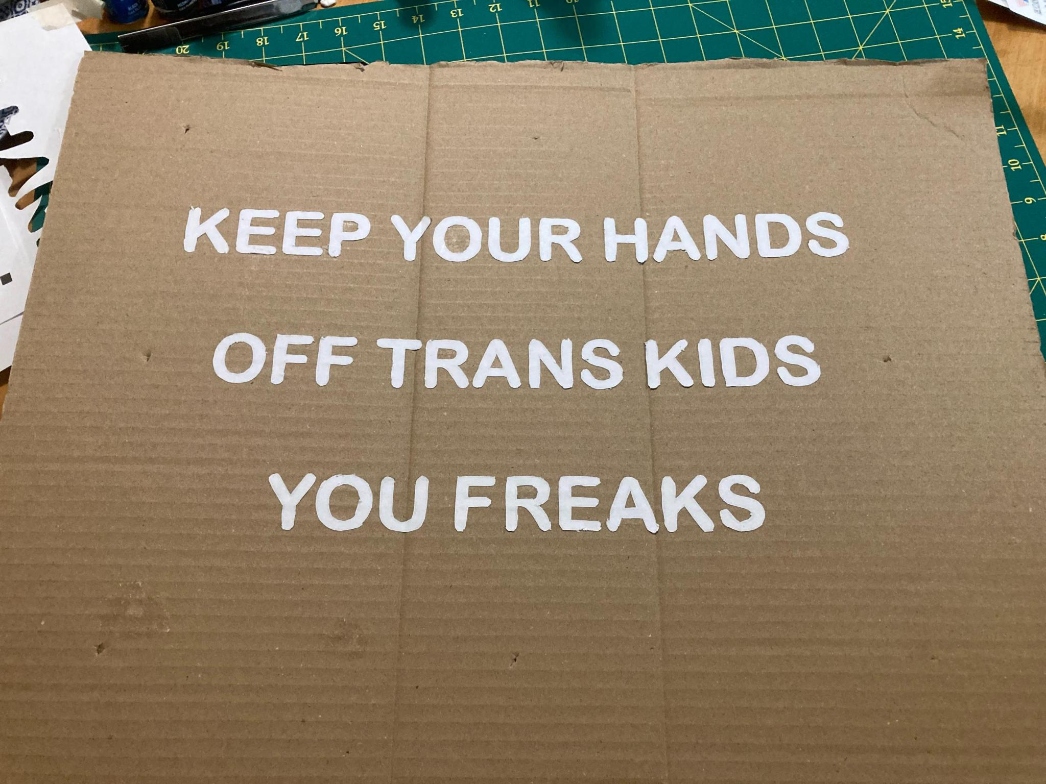 A cardboard protest sign that says "Keep your hands off trans kids you freaks"