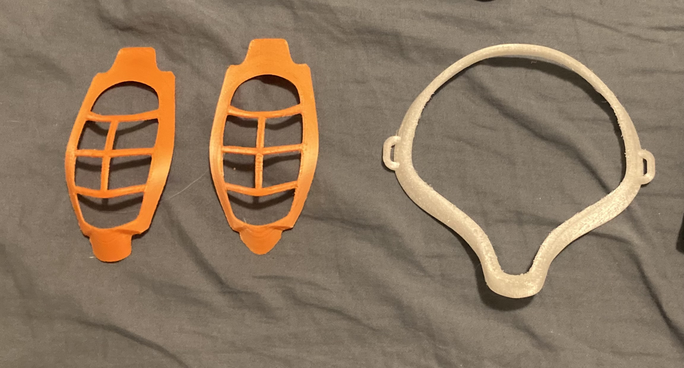 3d printed accessories for cloth breathing masks. Two orange mask inserts on the left, which are for preventing the mask from collapsing when breathing in. A white mask frame on the right, which goes around the outside of the mask for improving the air seal between mask and skin.