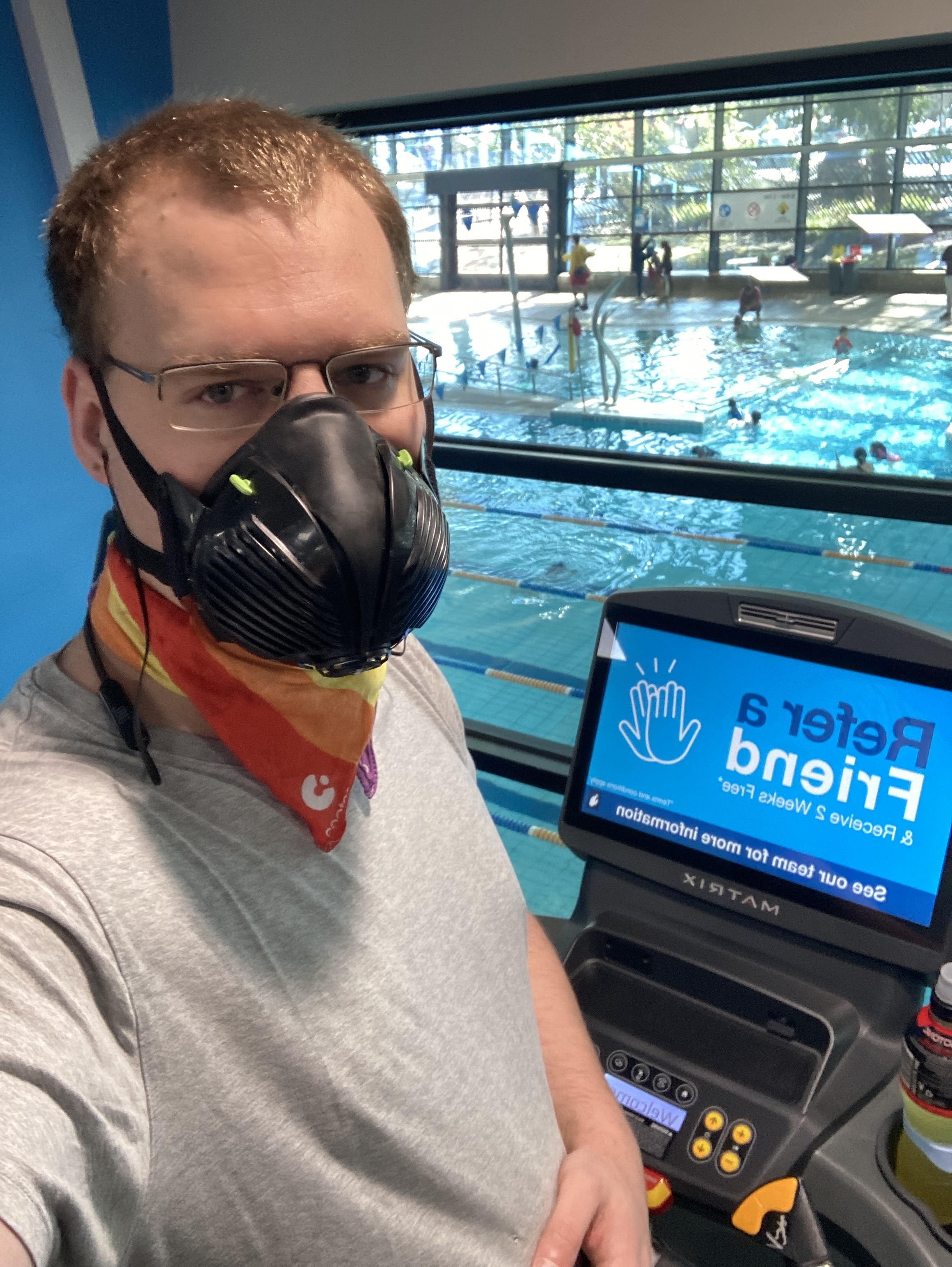 Selfie of a person (me) wearing a respirator (Trend Air Stealth) on a treadmill at the gym. In the background a swimming pool is seen.