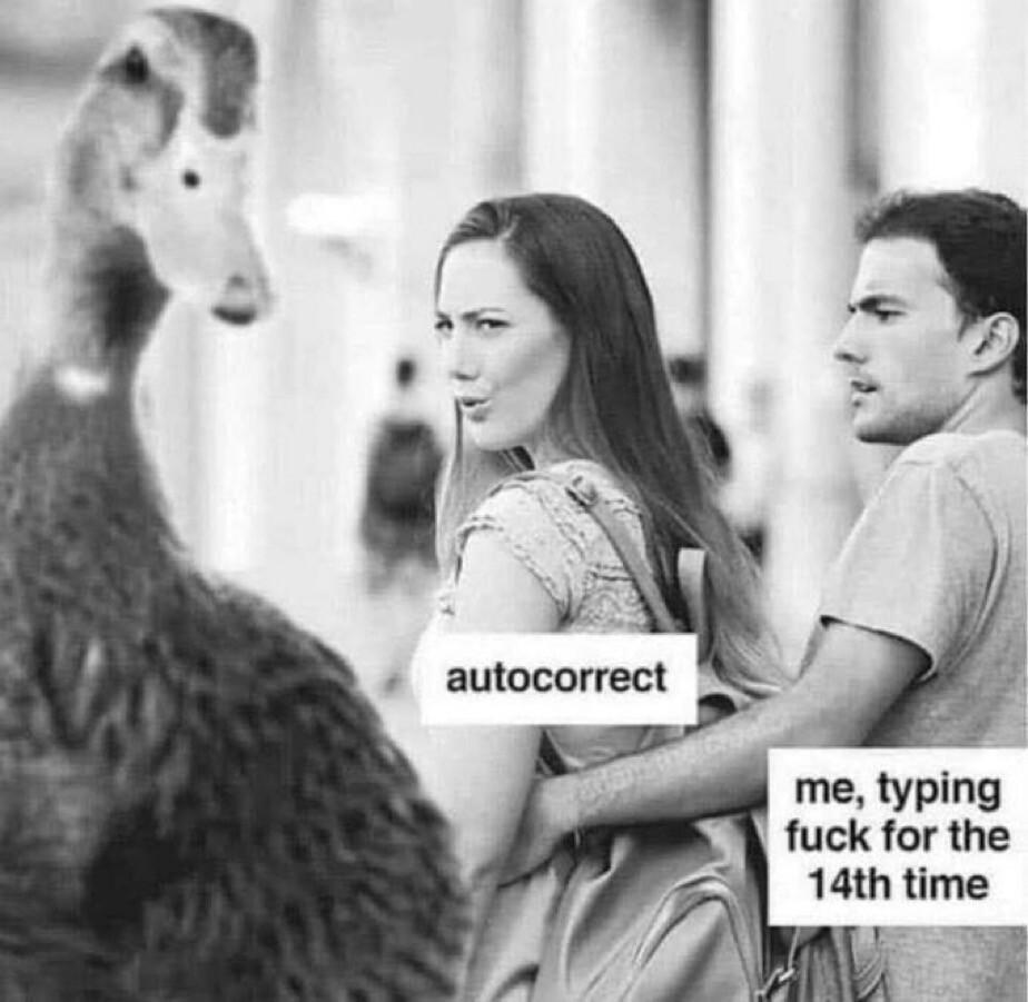Autocorrect (distracted girlfriend) looking at a duck, while the boyfriend ("me, typing fuck for the 14th time") looks on in annoyance