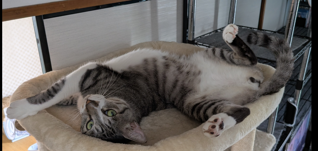 A grey and white tabby cat twisted so his back legs are pointing at the camera whilst his front legs are pointing the opposite direction.
