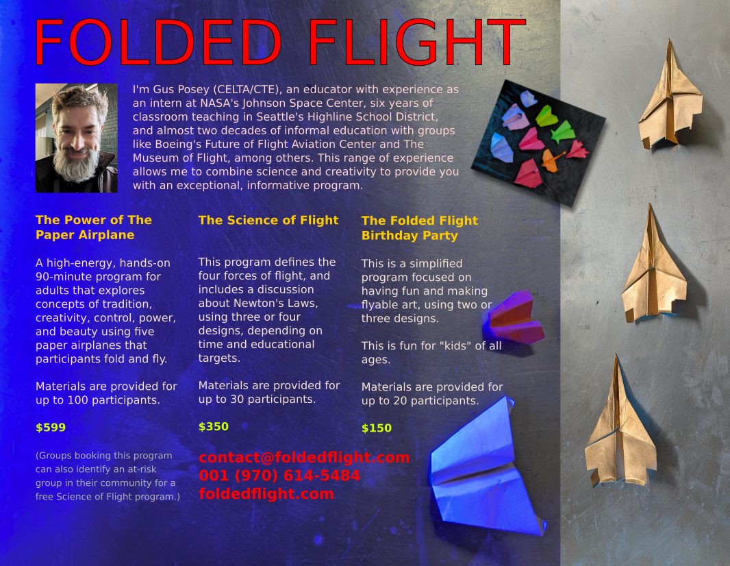 A colorful ad for my new venture. There are columns of text lots of paper airplanes, and one of me, a goofy white man with a beard. The top is a short bio of me, describing my work as a CELTA/CTE educator. The larger body of text reads: The Power of The Paper Airplane A high-energy, hands-on 90-minute program that explores concepts of tradition, creativity, control, power, and beauty using five paper airplanes that participants fold and fly. This is an ideal program for a group training or convention, or for any organization that wants to provide a memorable day for their staff. Materials are provided for up to 100 participants. $599 (Groups booking this program can also identify an at-risk group in their community for a free Science of Flight program.) The Science of Flight This program teaches the four forces of flight, the three axes of motion used in aircraft design and analysis, and a discussion about Newtonβs Third Law of Motion. Program participants typically build three or four designs, depending on educational targets. Materials are provided for up to 30 participants. $350 The Folded Flight Birthday Party This is a simplified program focused on having fun and making flyable art, using two or three designs. This is for βkids of all ages,β and the program can be customized for younger participants, or modified to include more complex designs for more capable guests. Materials are provided for up to 20 participants. $150 contact@foldedflight.com