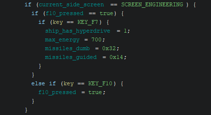 code in ghidra, reading: if (current_side_screen == SCREEN_ENGINEERING) { if (f10_pressed == true) { if (key == KEY_F7) { ship_has_hyperdrive = 1; max_energy = 700; missiles_dumb = 0x32; missiles_guided = 0x14; } } else if (key == KEY_F10) { f10_pressed = true; } }