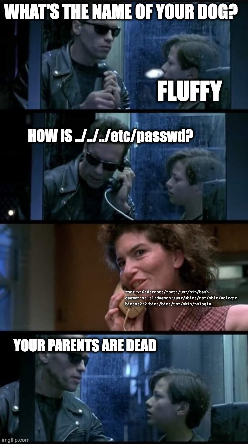Terminator asks a young John Connor "What's the name of your dog?" John replies "Fluffy" Terminator asks into the phone: "How is ../../../etc/passwd?" A woman who looks just like John's mom replies into her phone with the contents of a /etc/passwd file. Terminator looks to John and says "Your parents are dead"